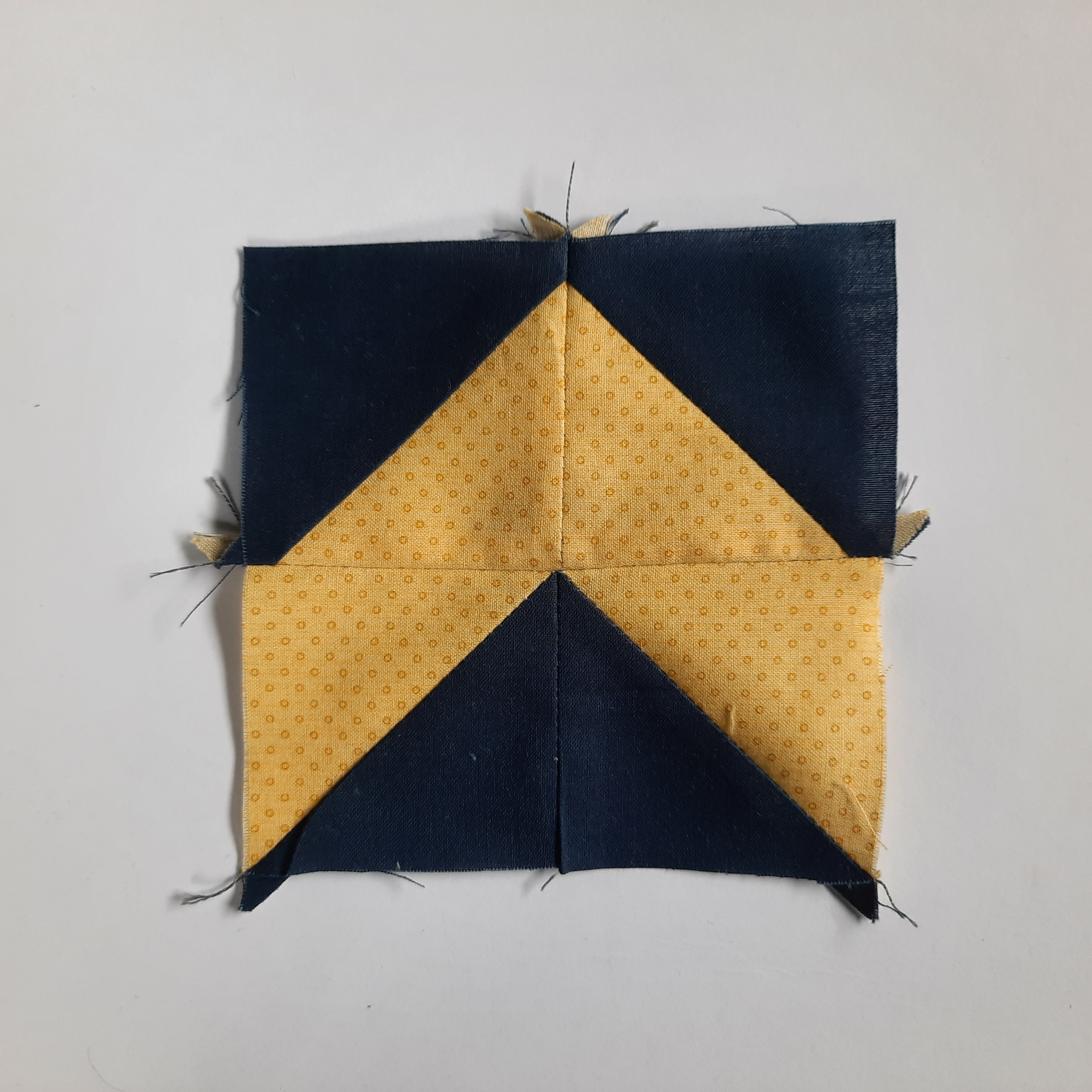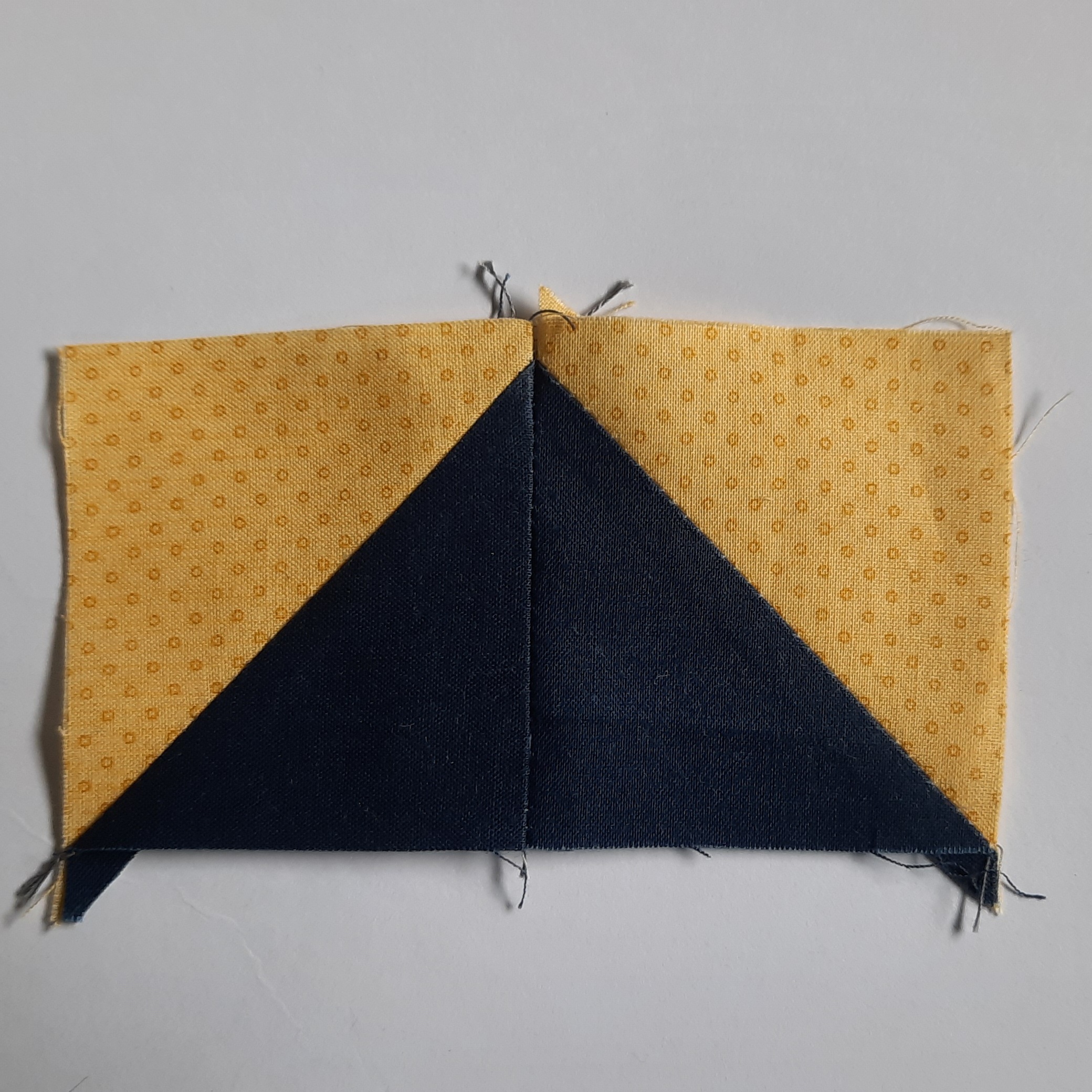 1 Take one yellow and one navy 2⅞ x 2⅞” square and make two half-square triangle units by following the instructions given in the January post here