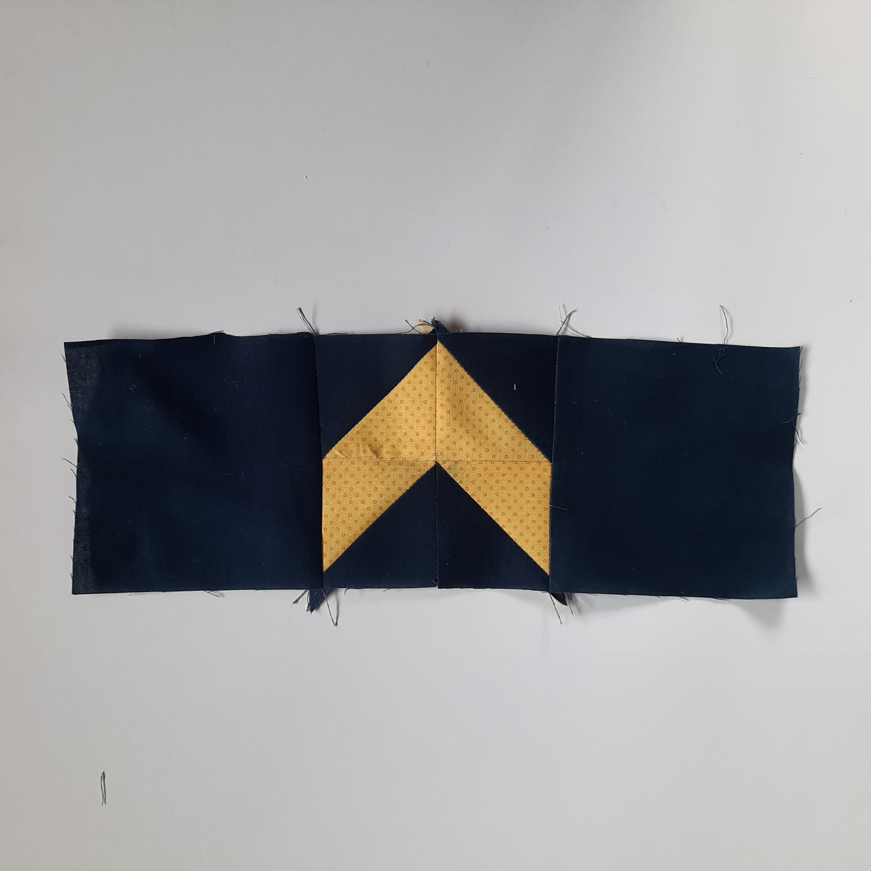 9 Make row 3 of the block: Join a 4½ x 4½” navy square to an arrow unit pointing upwards, then add a second 4½ x 4½” navy square.