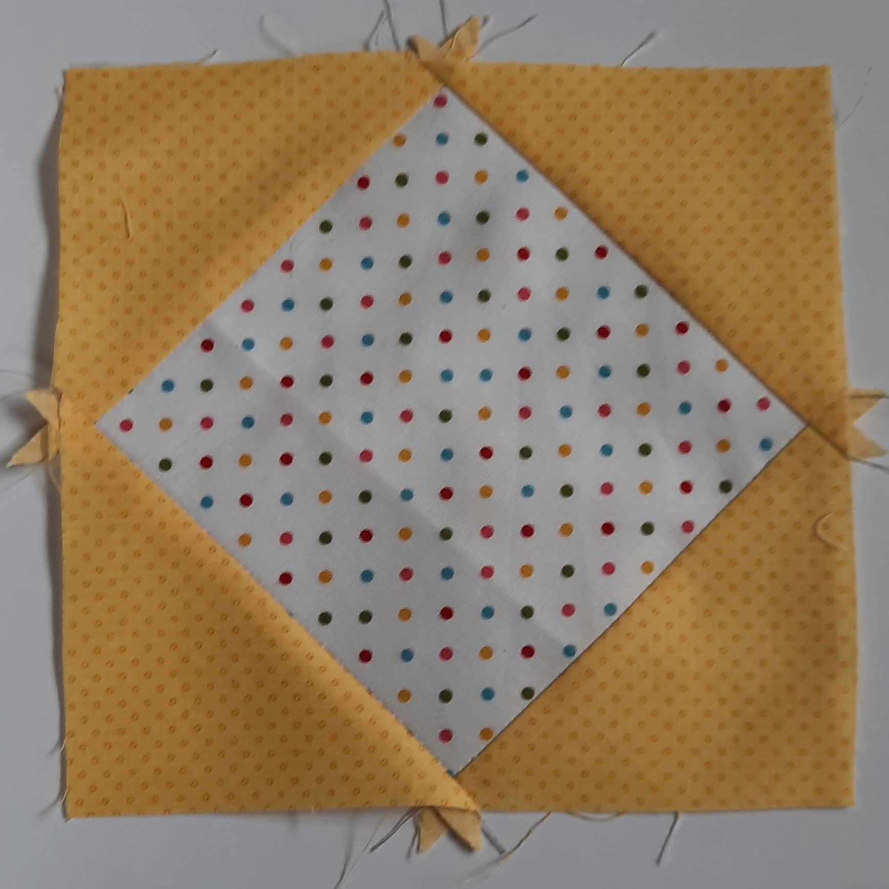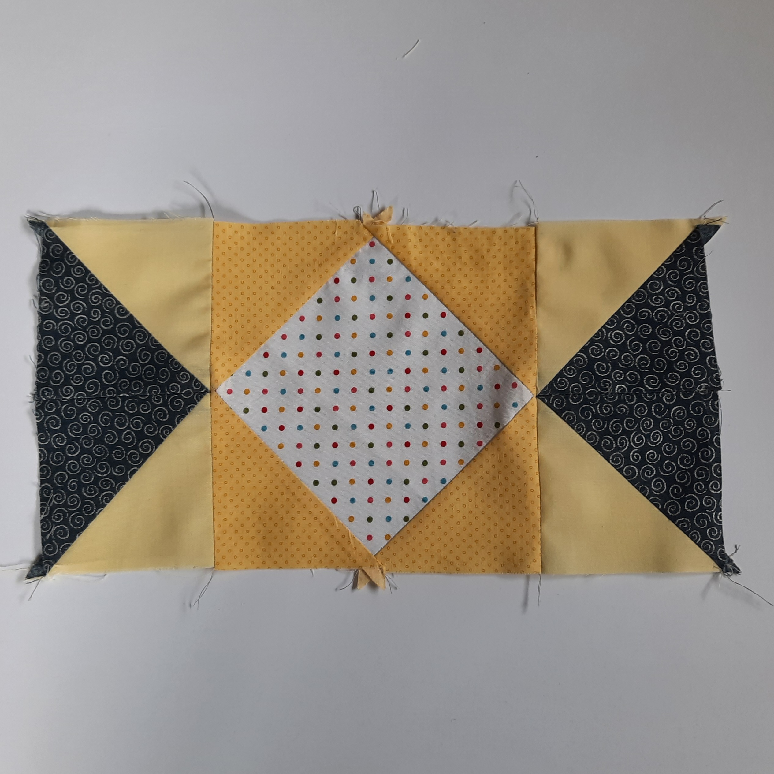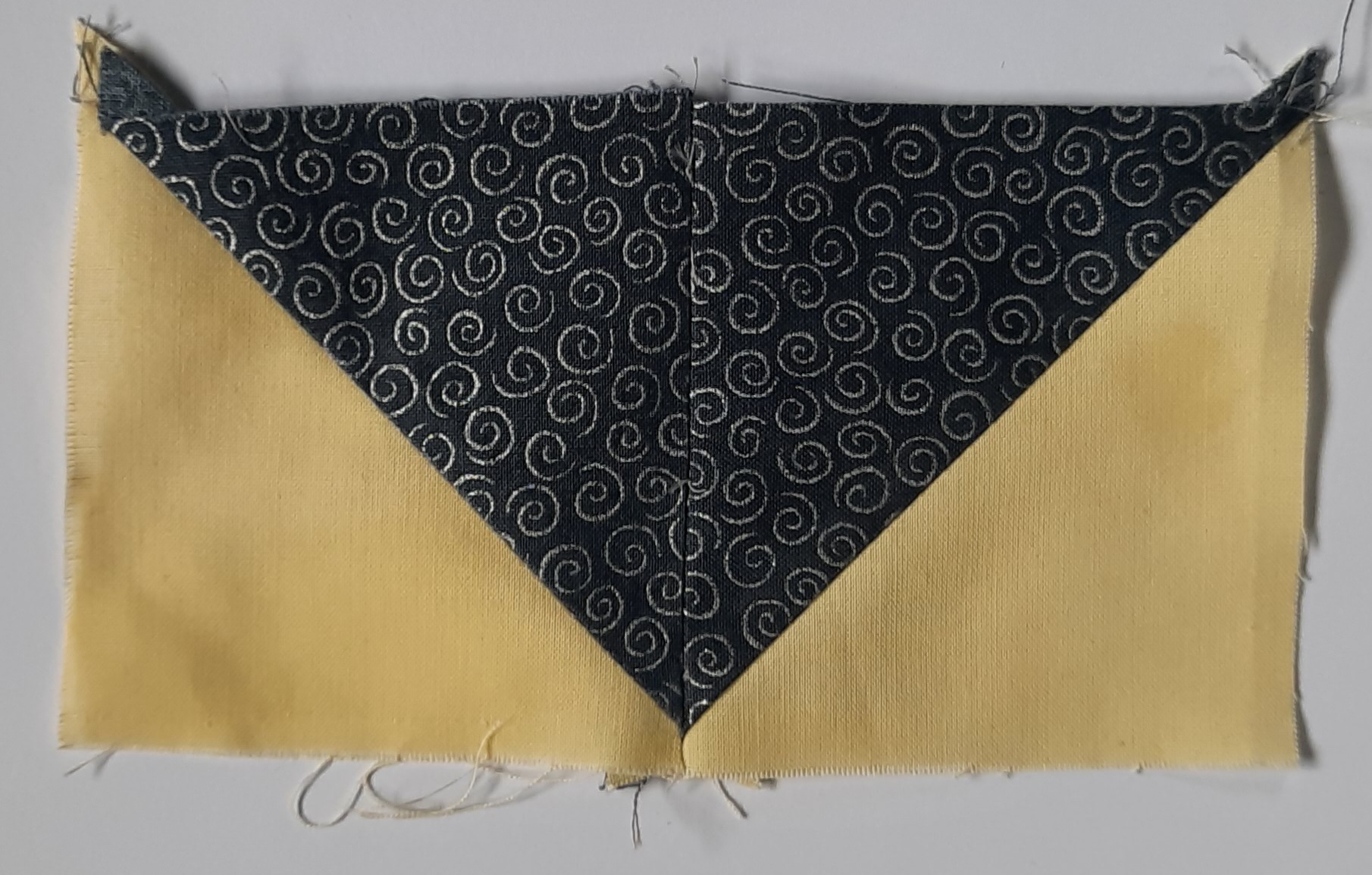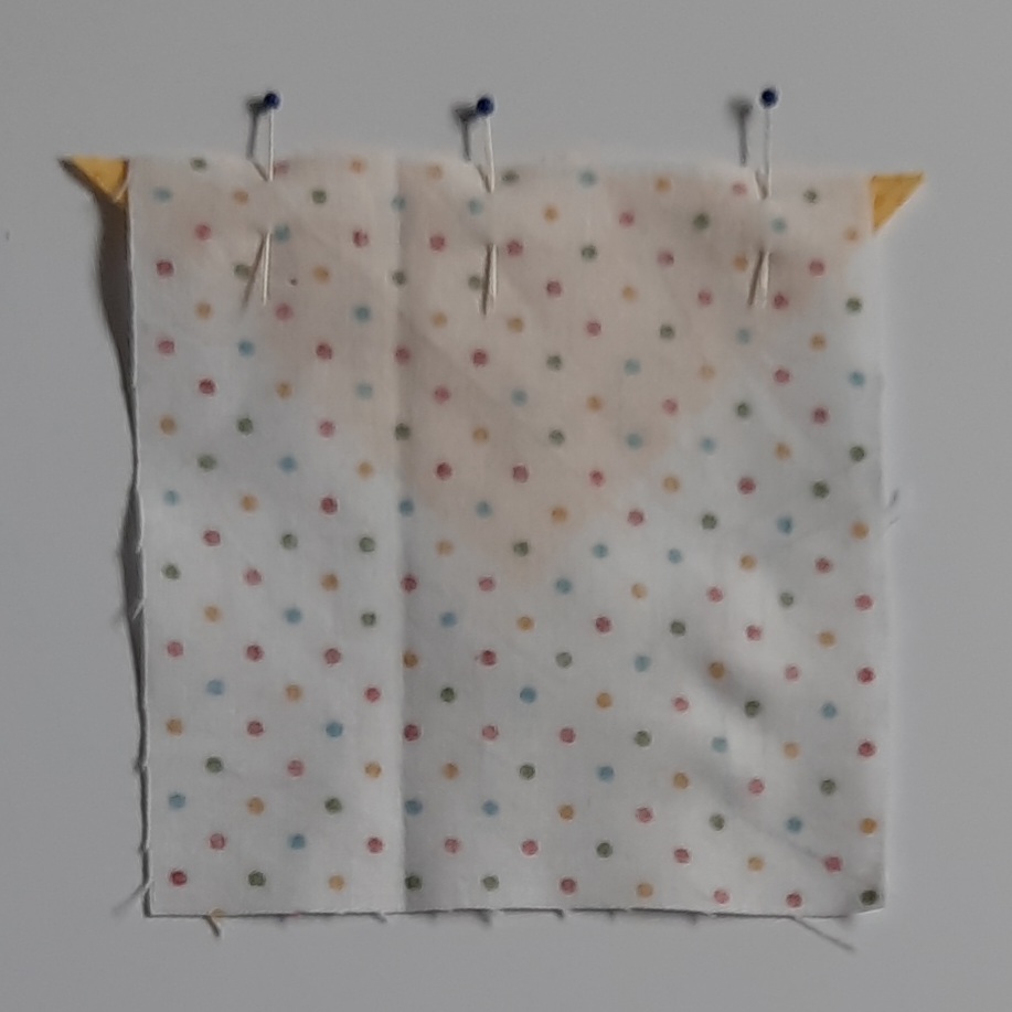 4 Lay the remaining two dark yellow triangles, right sides together on the remaining two sides of the white square. Pin, stitch and press as before.