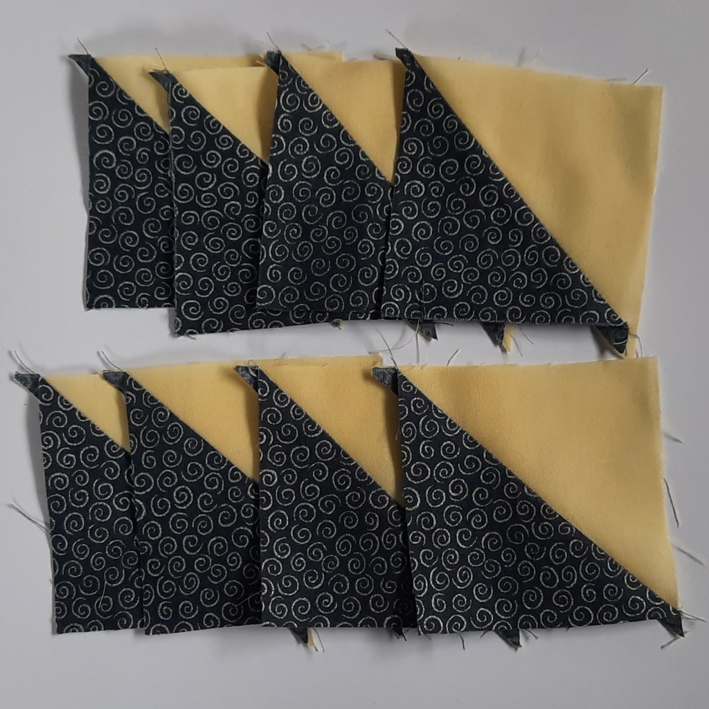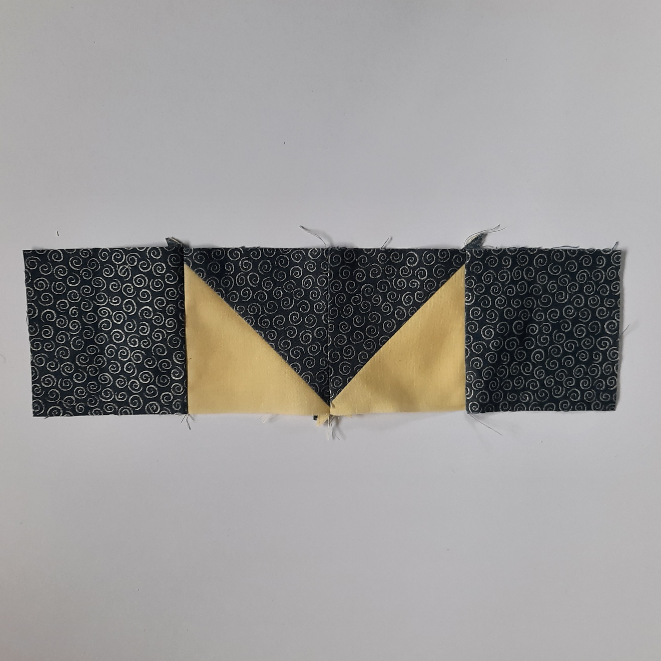 1 Check the January post (link above) for how to make half-square triangles. Use four 3⅞ x 3⅞” pale yellow squares and four 3⅞ x 3⅞” navy squares to make eight half-square triangle units like the ones below. Press the seam and then press the seam allowances over to the navy blue side.