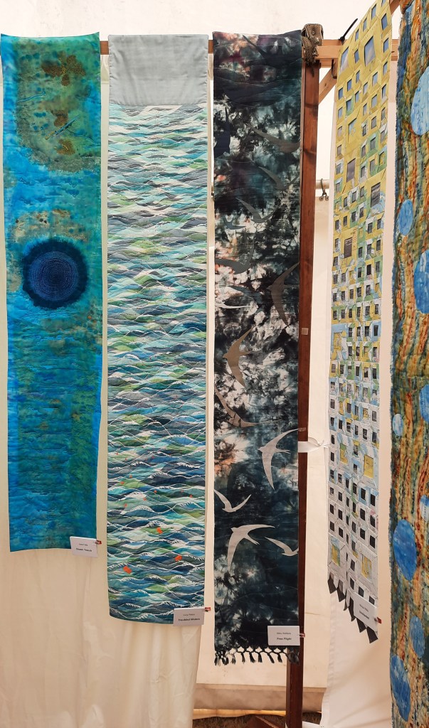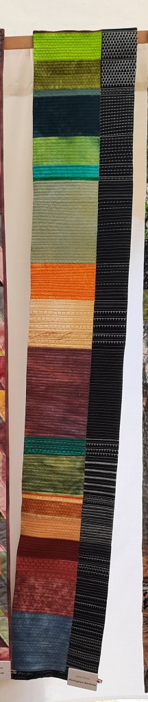 I am a member of the Contemporary Quilt Group (one of the specialist groups within The Quilters’ Guild) so of course I was particularly interested in the displays by the Contemporary Quilt Kent group members. Below are some of the quilts submitted with the theme ‘Uncharted’. (Each measured 150-200cm long by 30cm wide at the top)