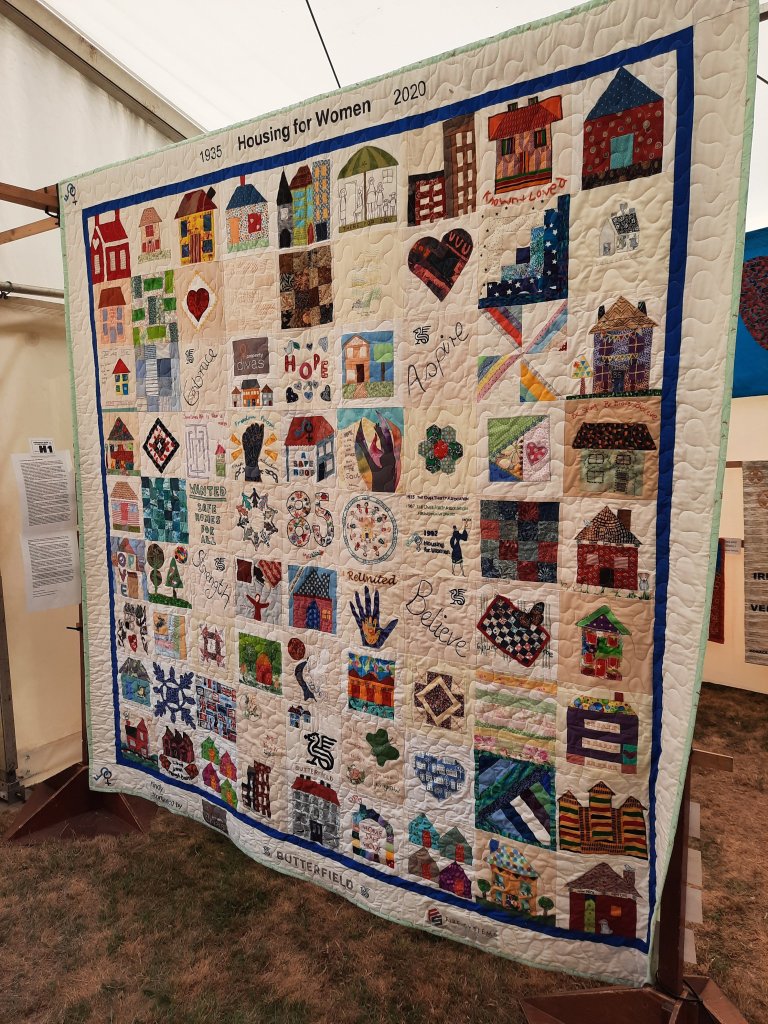 At the end of the tent was a splendid charity quilt ‘The Housing for Women Quilt’ consisting of 85 ten inch blocks made by many contributors during the Covid period 2020-21, the whole project coordinated by Alison Scrimshaw. You can learn more about the charity, which is based in Brixton, London using this link: https://www.hfw.org.uk There is a link on the front page of the website to find out more about the quilt.