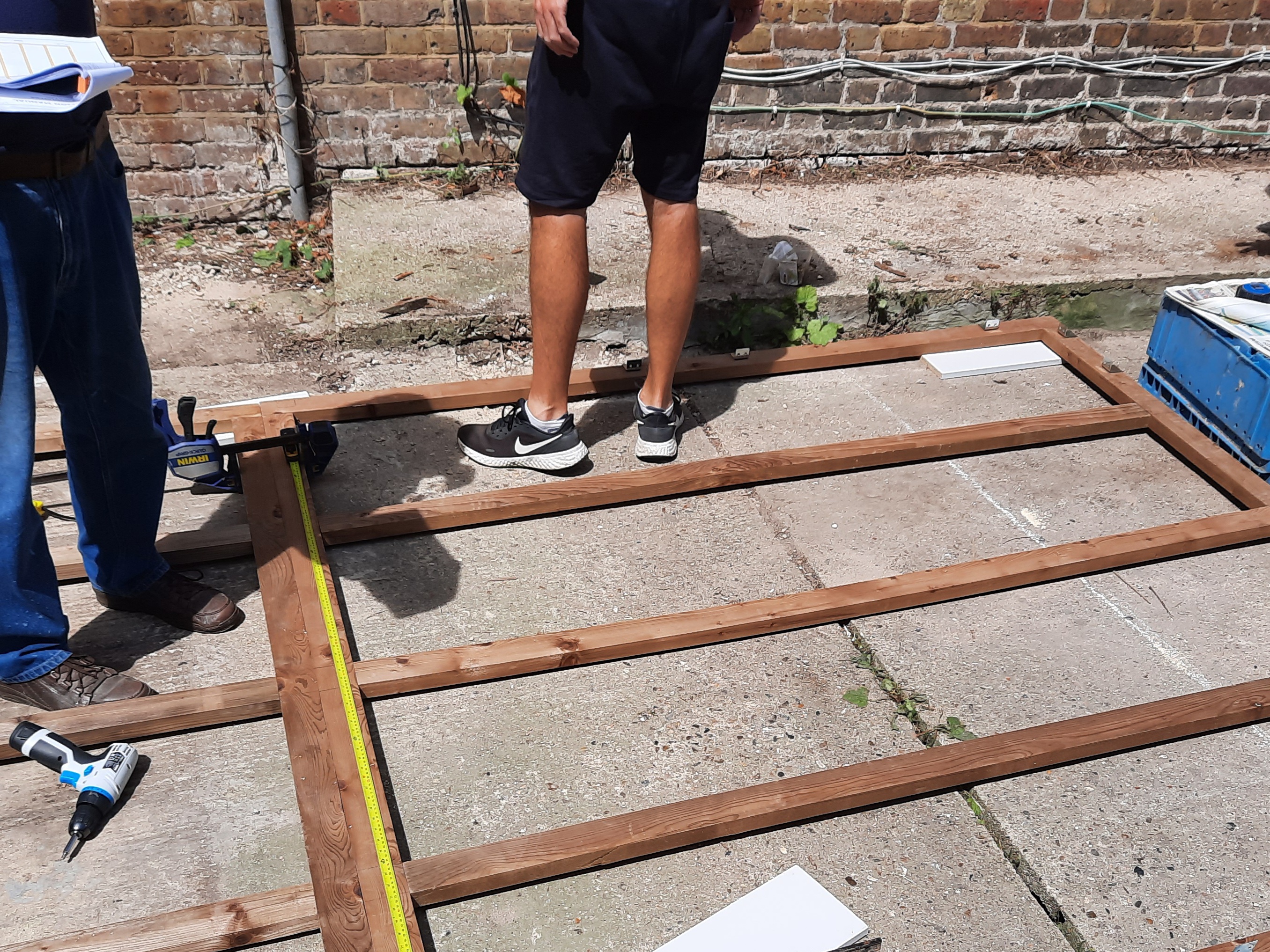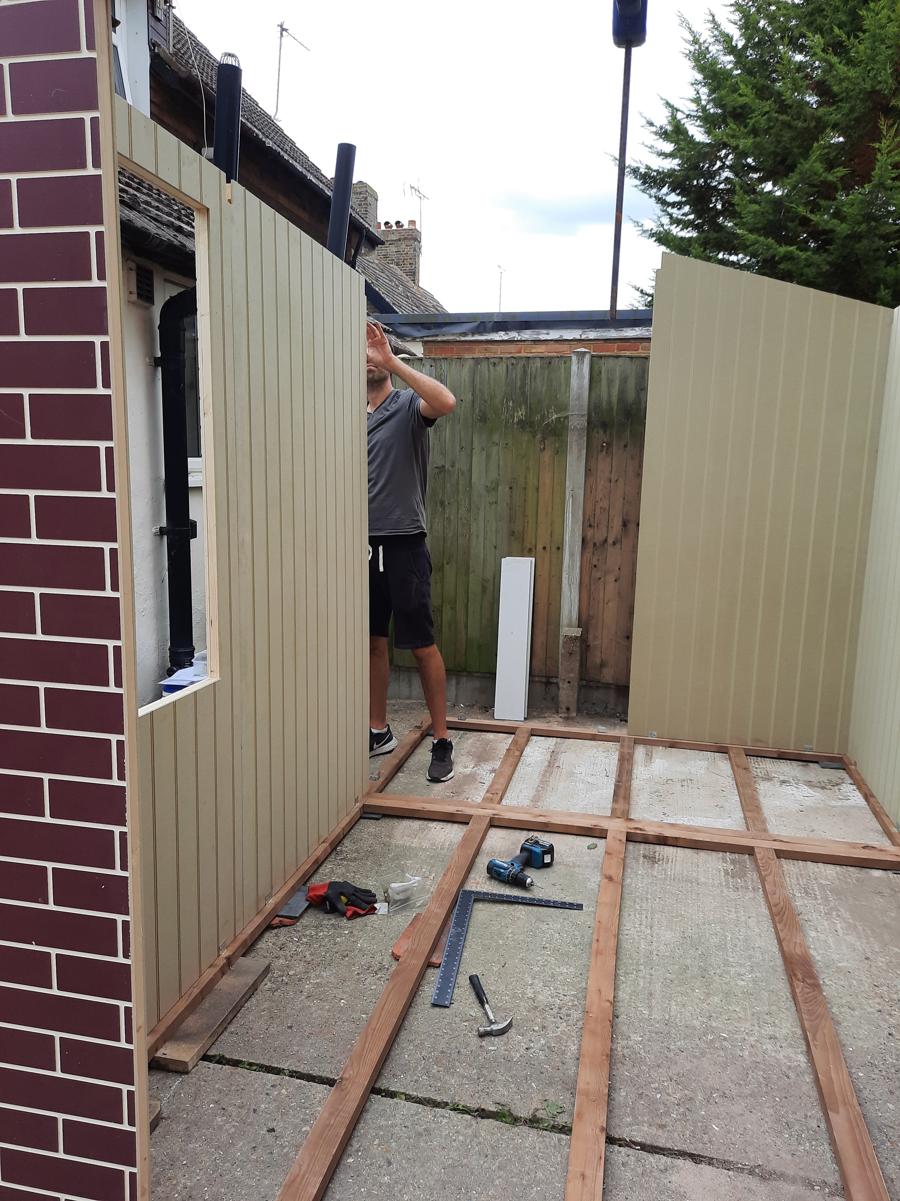 The left-hand door frame is in and two of the left-hand side panels are in place.