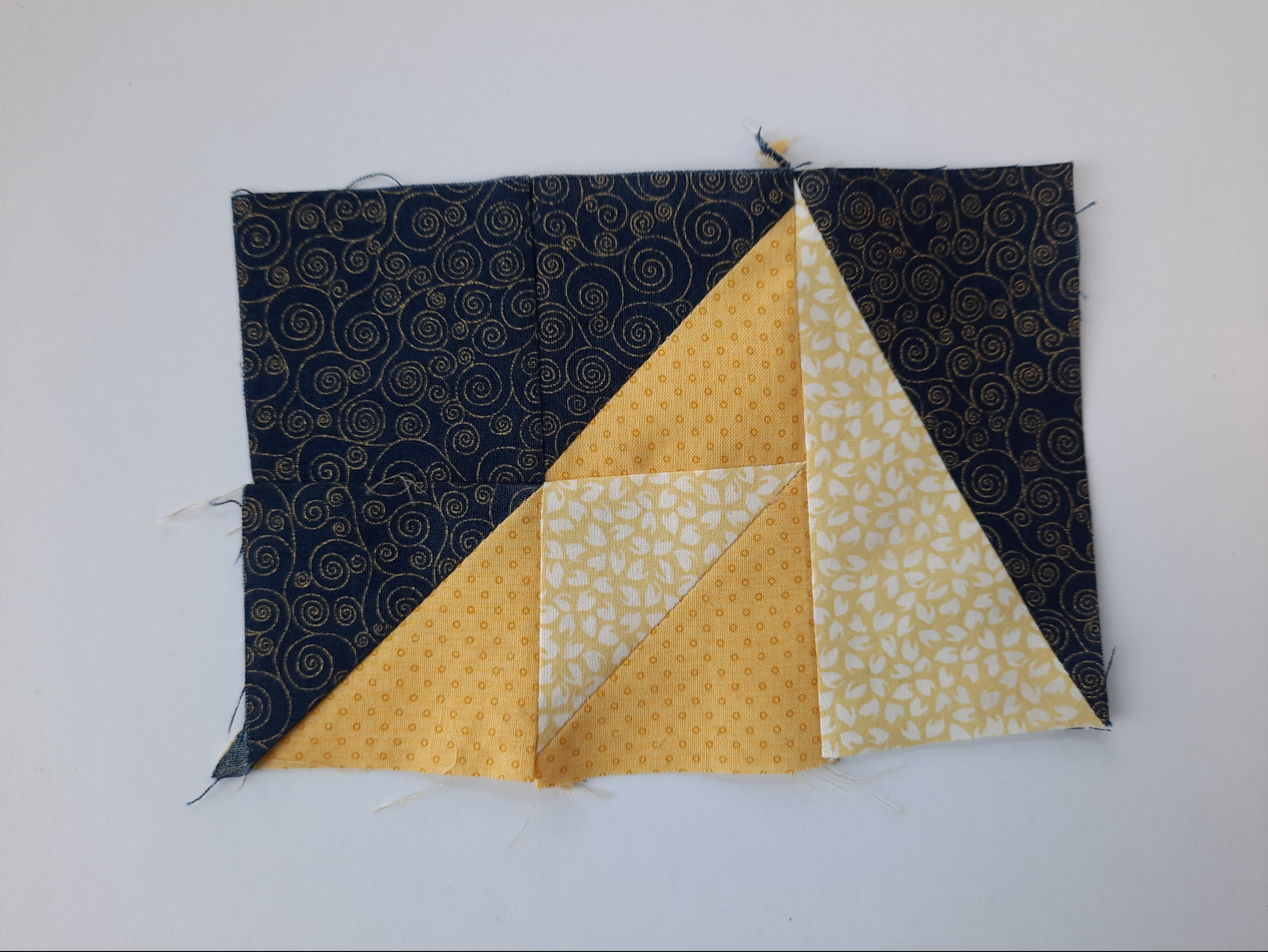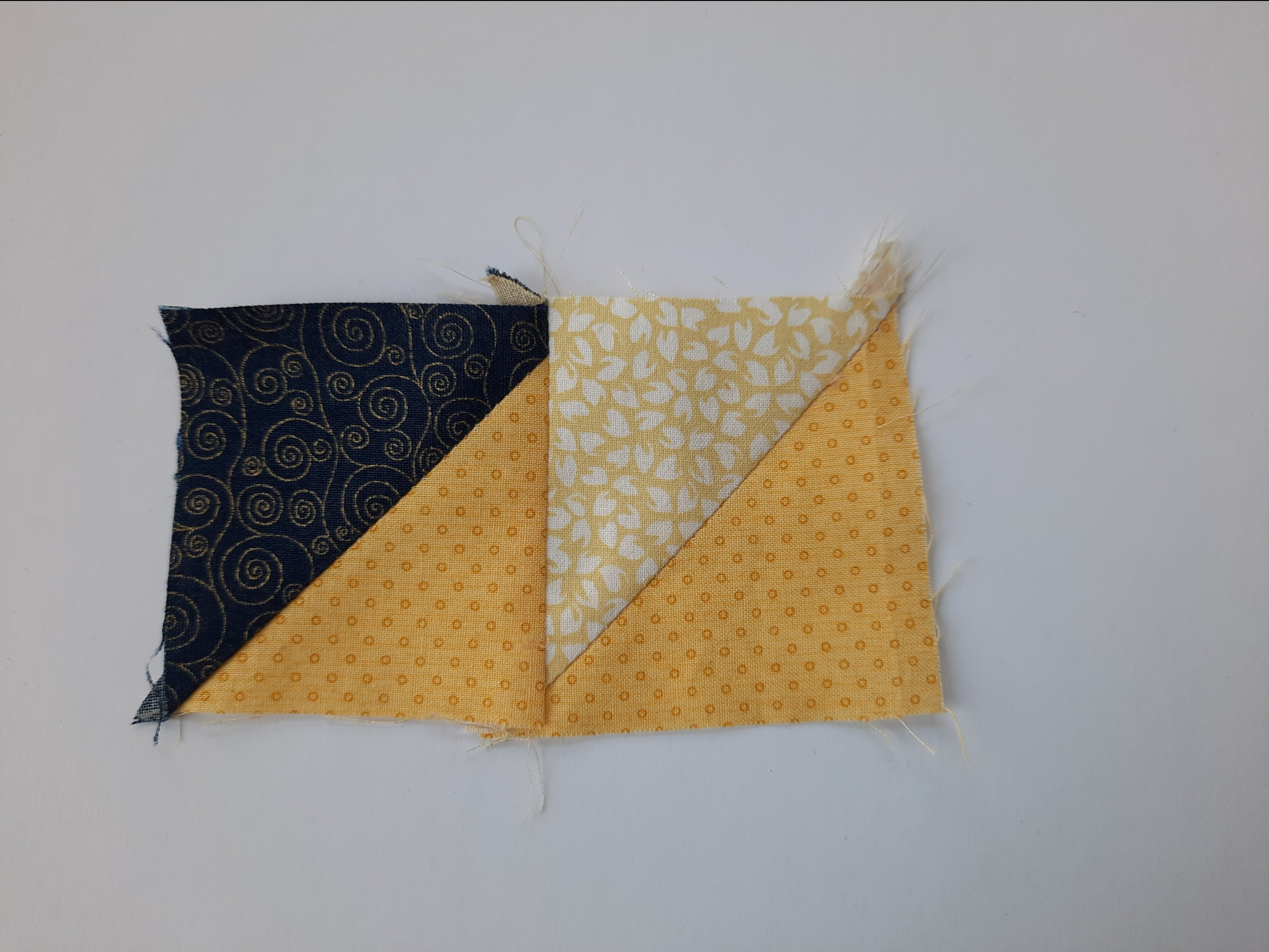 5 Take a 2⅞ x 2⅞” square of dark yellow print fabric and a 2⅞ x 2⅞” square of navy fabric and make two dark yellow/navy half-square triangle units.