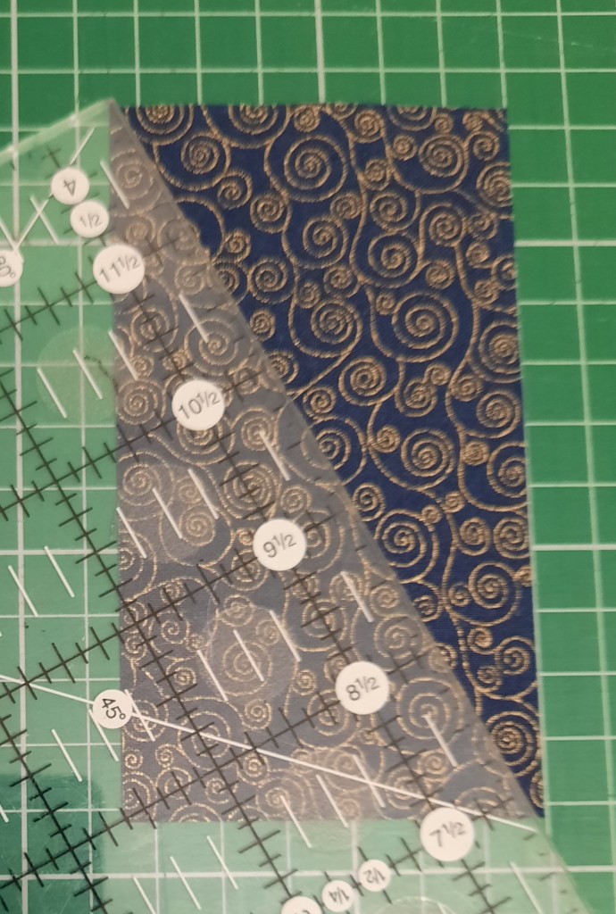 from the navy print fabric, cut four oblongs 5¼ x 2¾” then cut two of the oblongs from the top right-hand corner to the bottom left-hand corner, as shown.