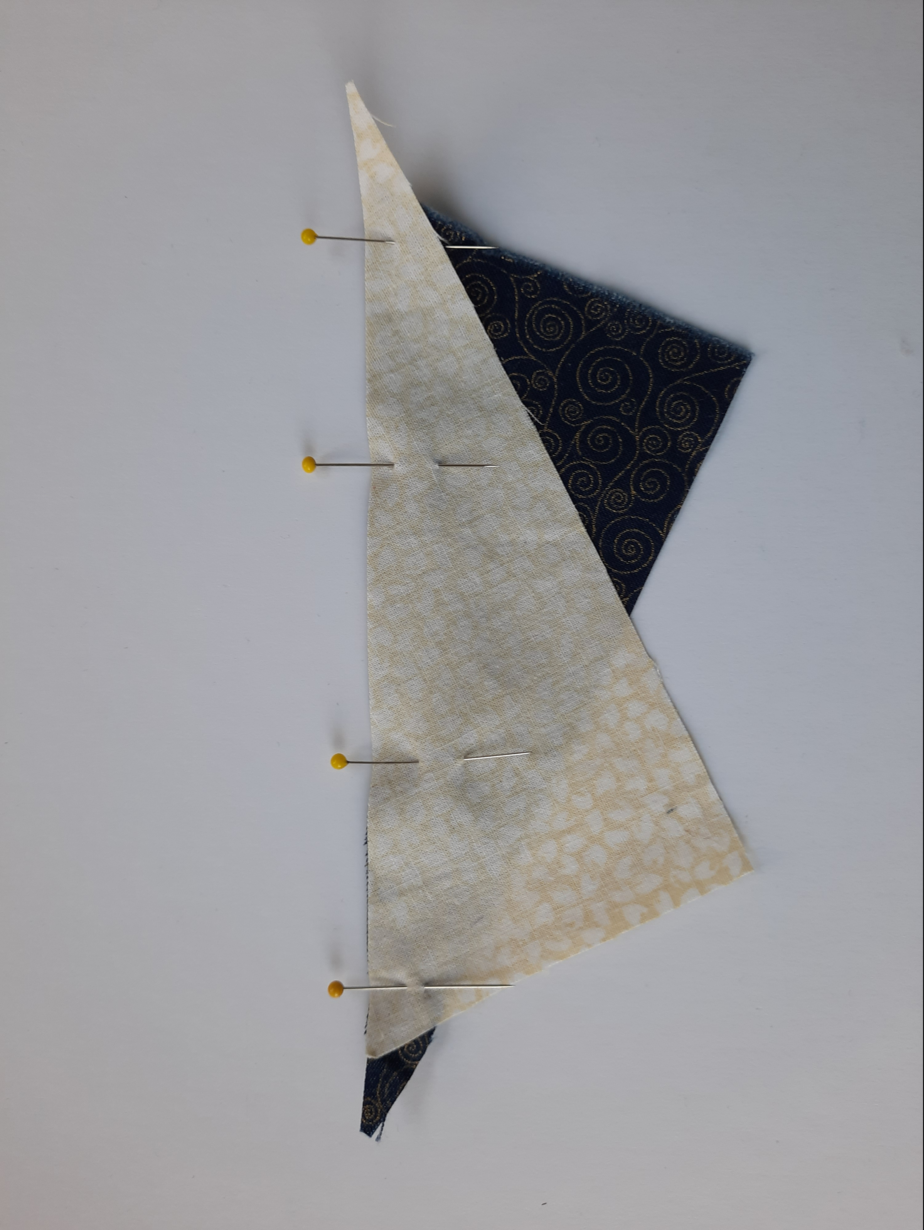 8 Pin a navy ‘right-hand’ half-oblong triangle to a pale yellow ‘right-hand’ half-oblong triangle, as shown.