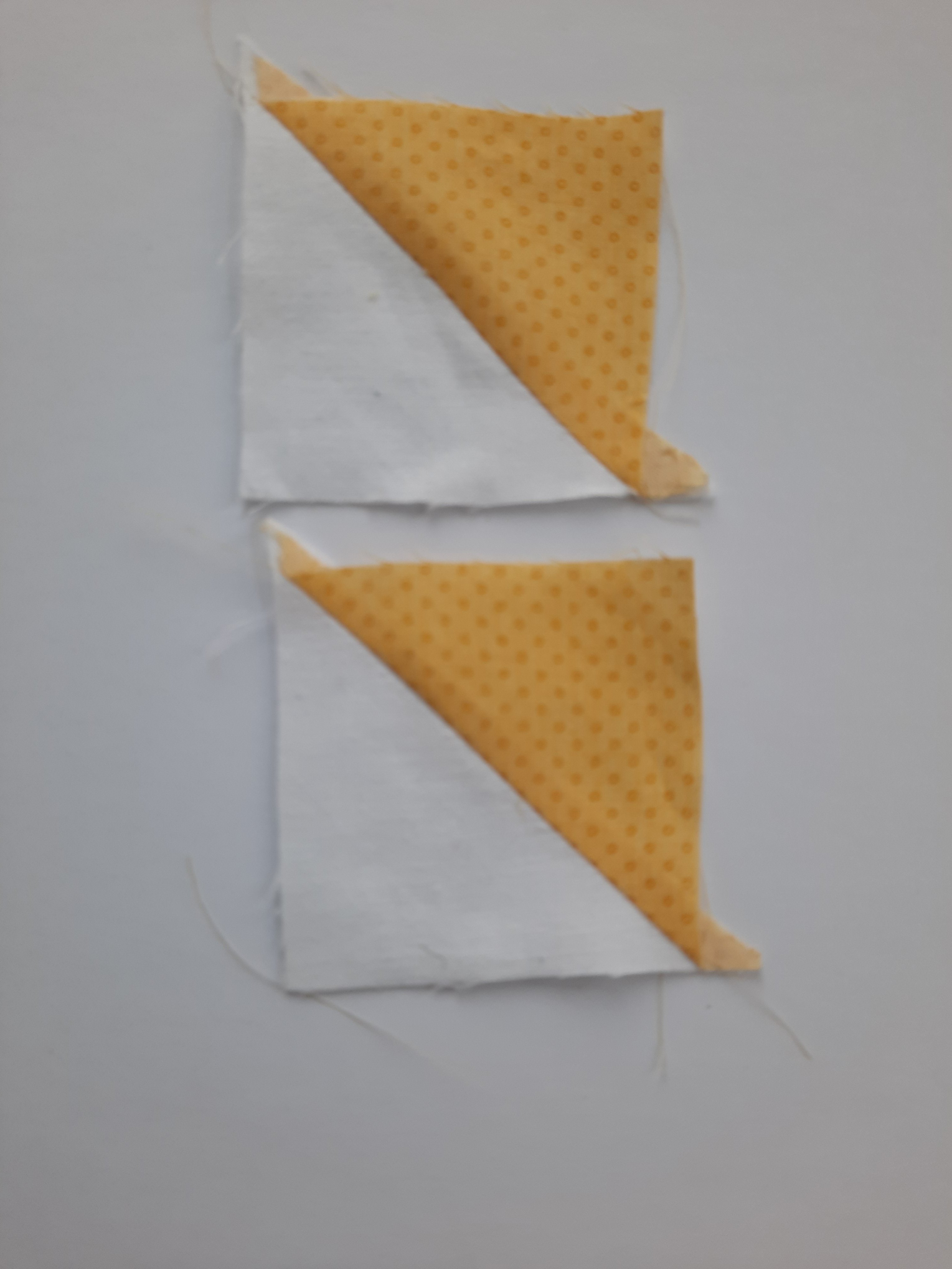 1 Take a 2⅞ x 2⅞” square of white solid fabric and a 2⅞ x 2⅞” of dark yellow print fabric. Follow the instructions in the January post (link above) for making half-square triangle units to make two white/dark yellow units.