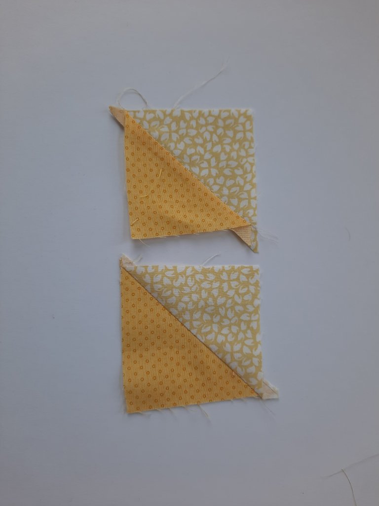 3 Take a 2⅞ x 2⅞” square of pale yellow print fabric and a 2⅞ x 2⅞” square of dark yellow fabric and make two pale yellow/dark yellow half-square triangle units.