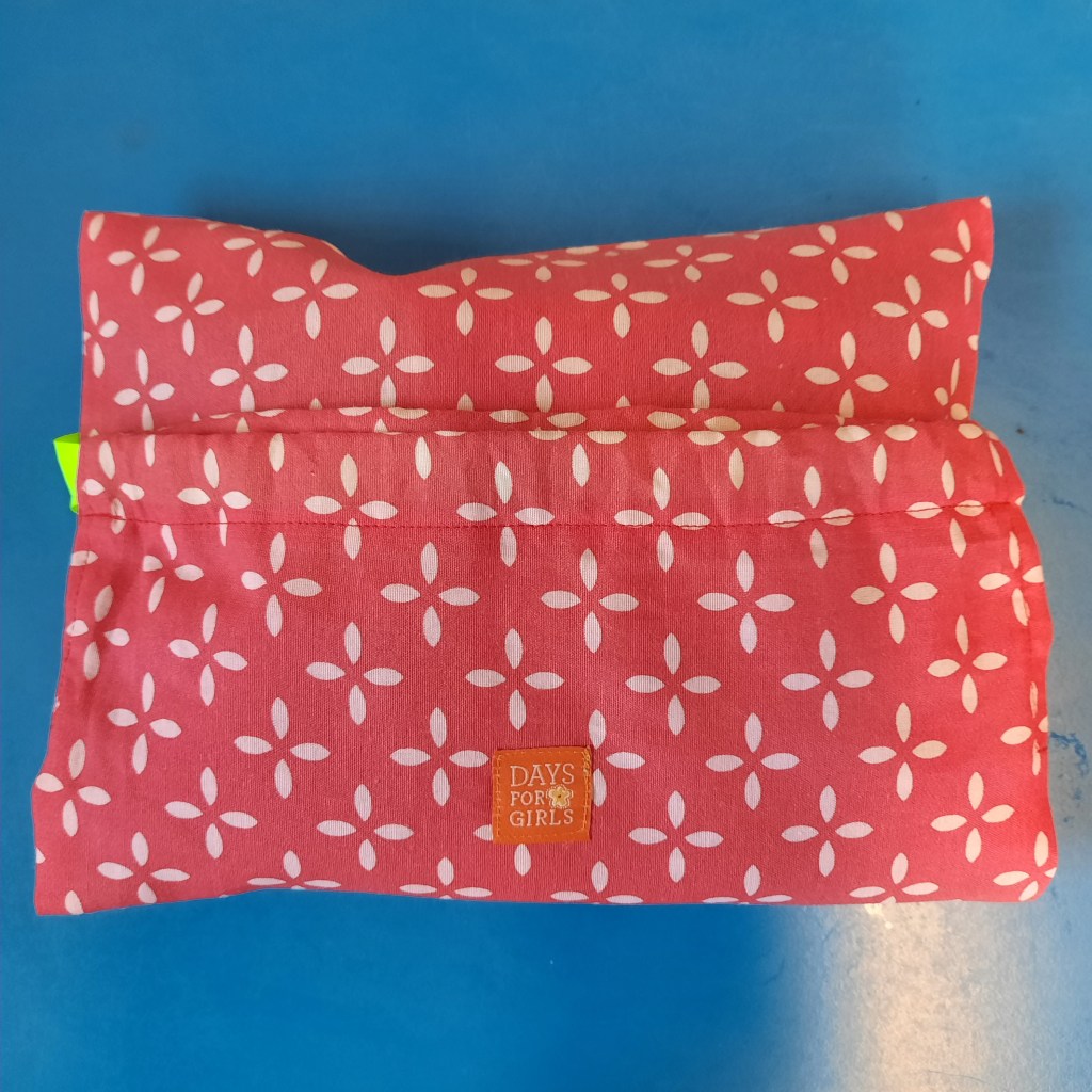 The bag contains a reusable period kit for girls and women to use each month. These kits allow women to go to school or to work when they are having a period, when otherwise they would miss out.
