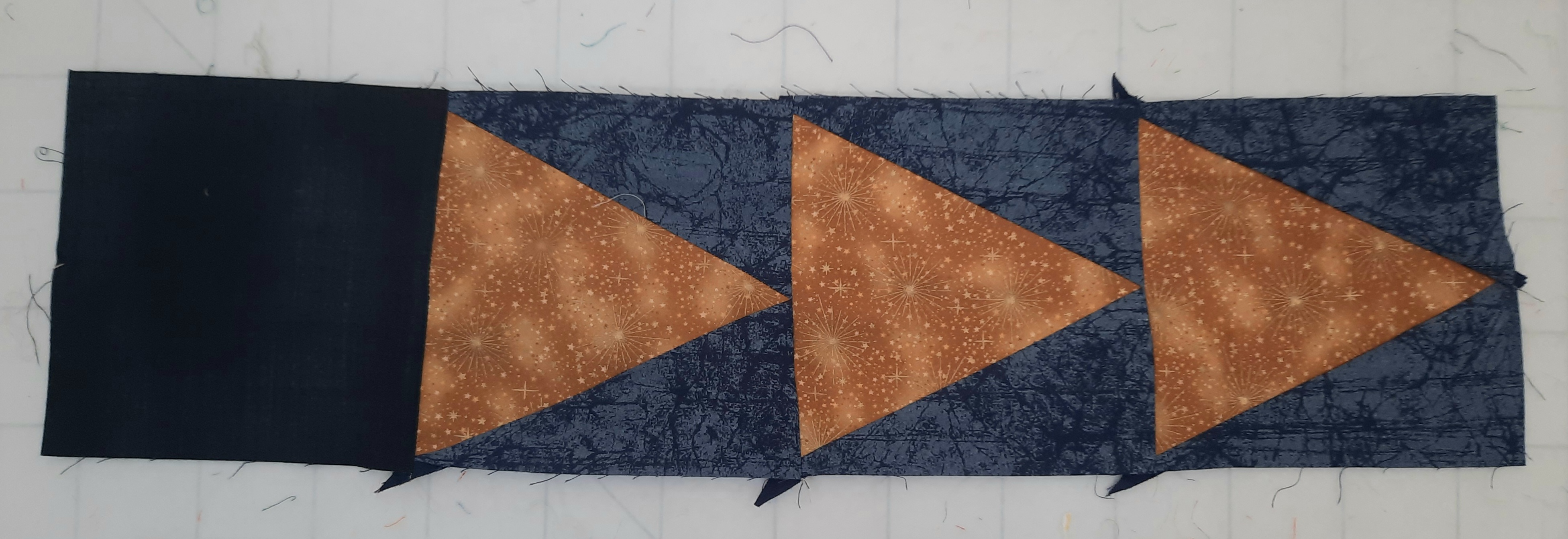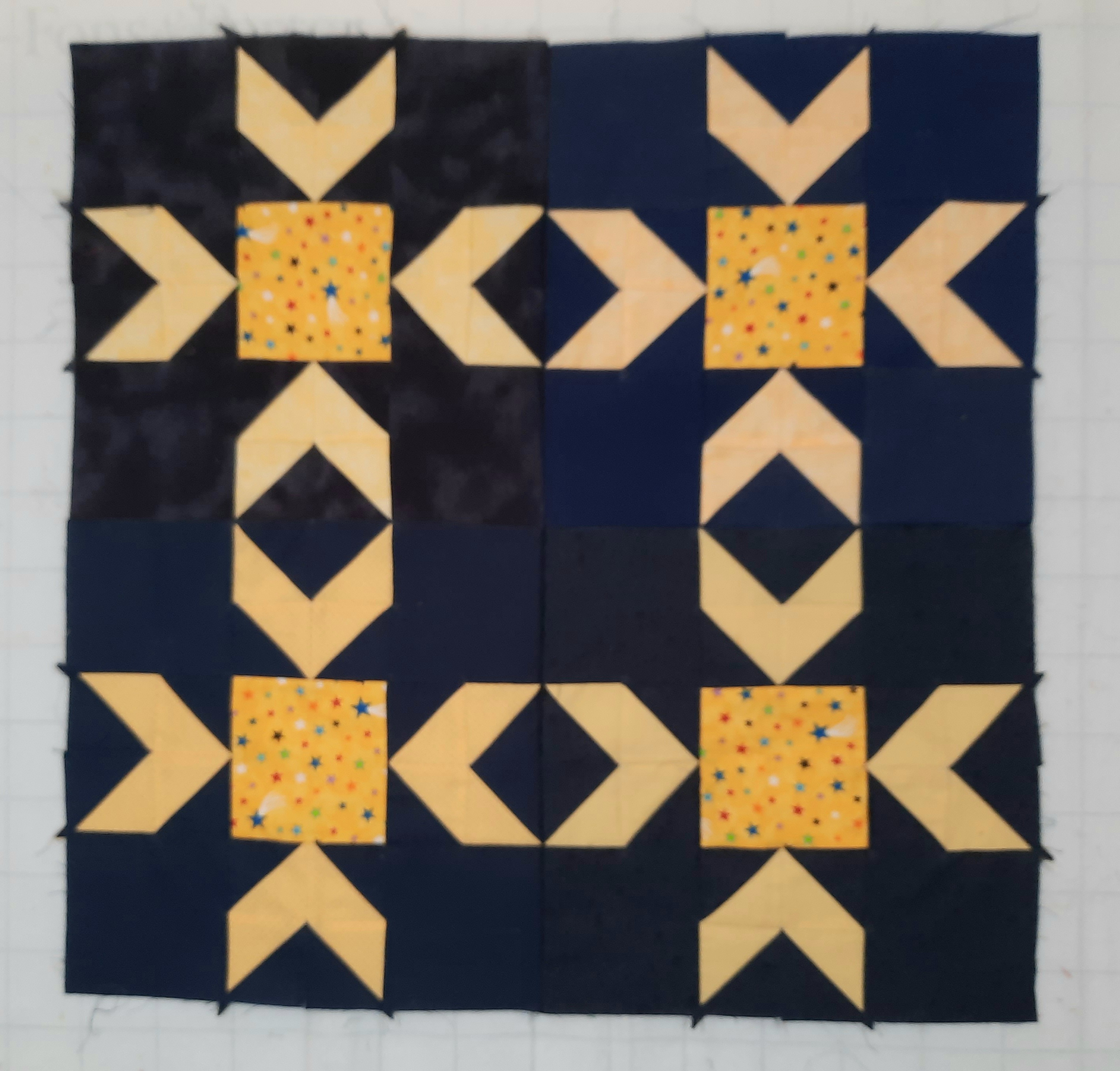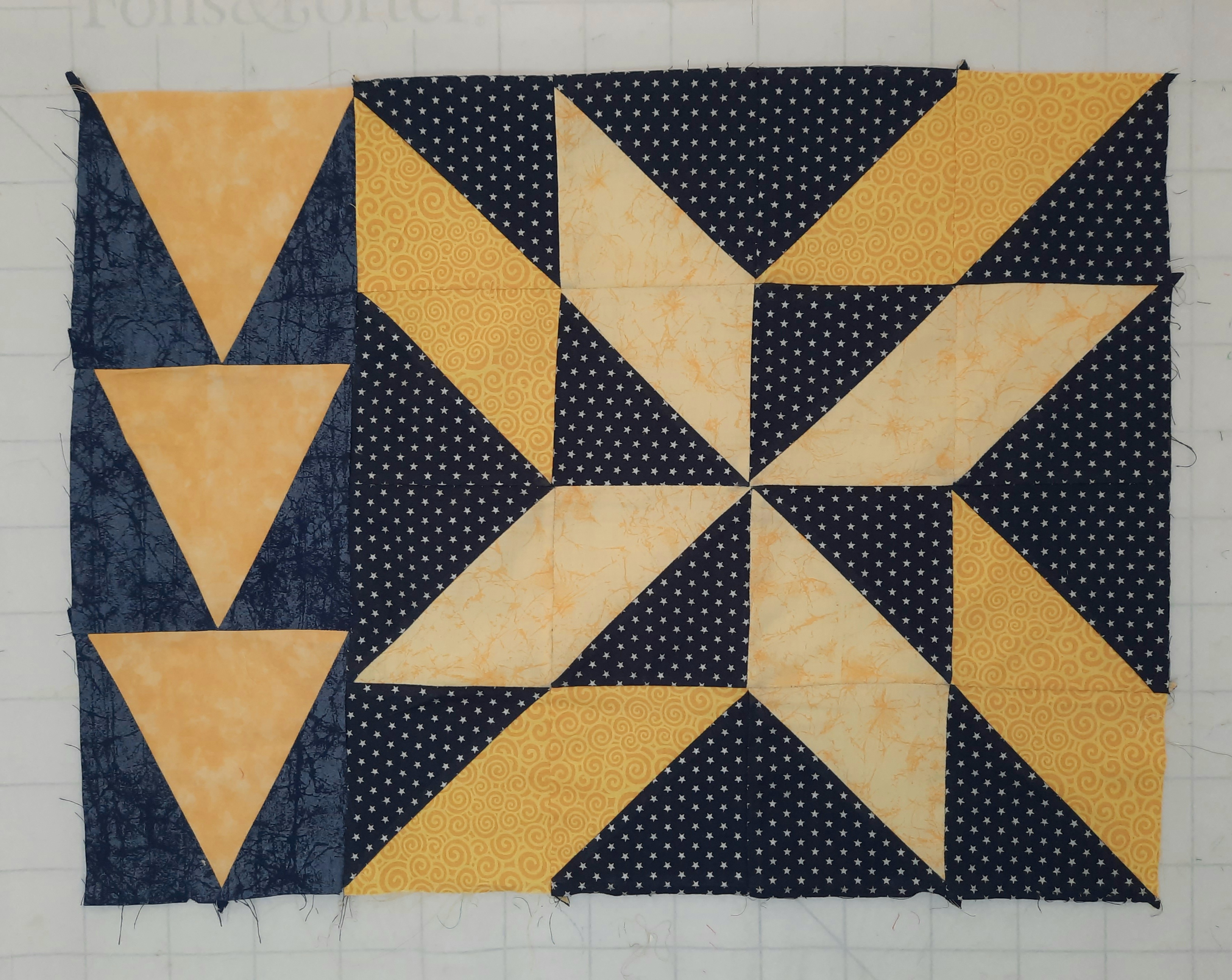 10 Join another set of three February blocks with the arrows pointing to the right. Add a navy-blue block to the left of these.