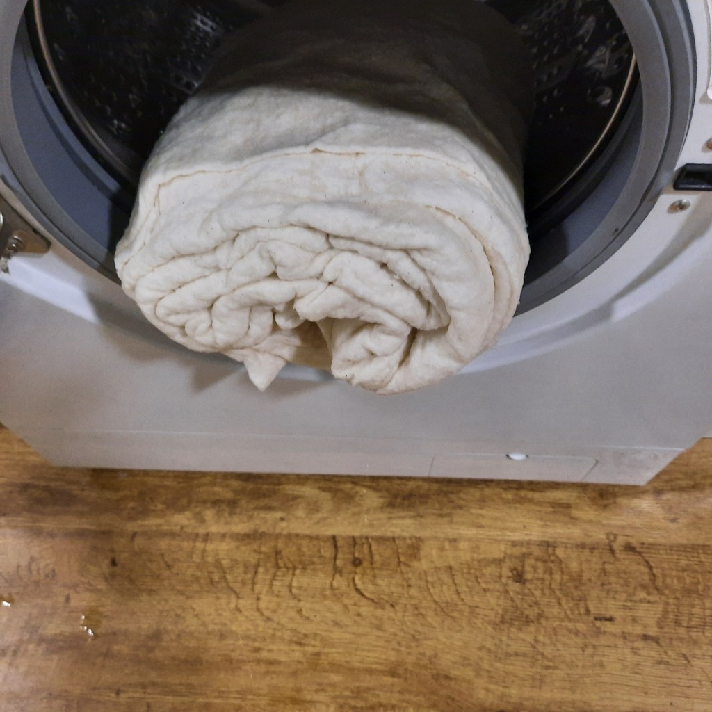 This is the wadding as it comes out after the spin cycle. It is still intact and without any stretching or damage. I dry it, still in the ‘long folds’ shape on a flat laundry dryer.