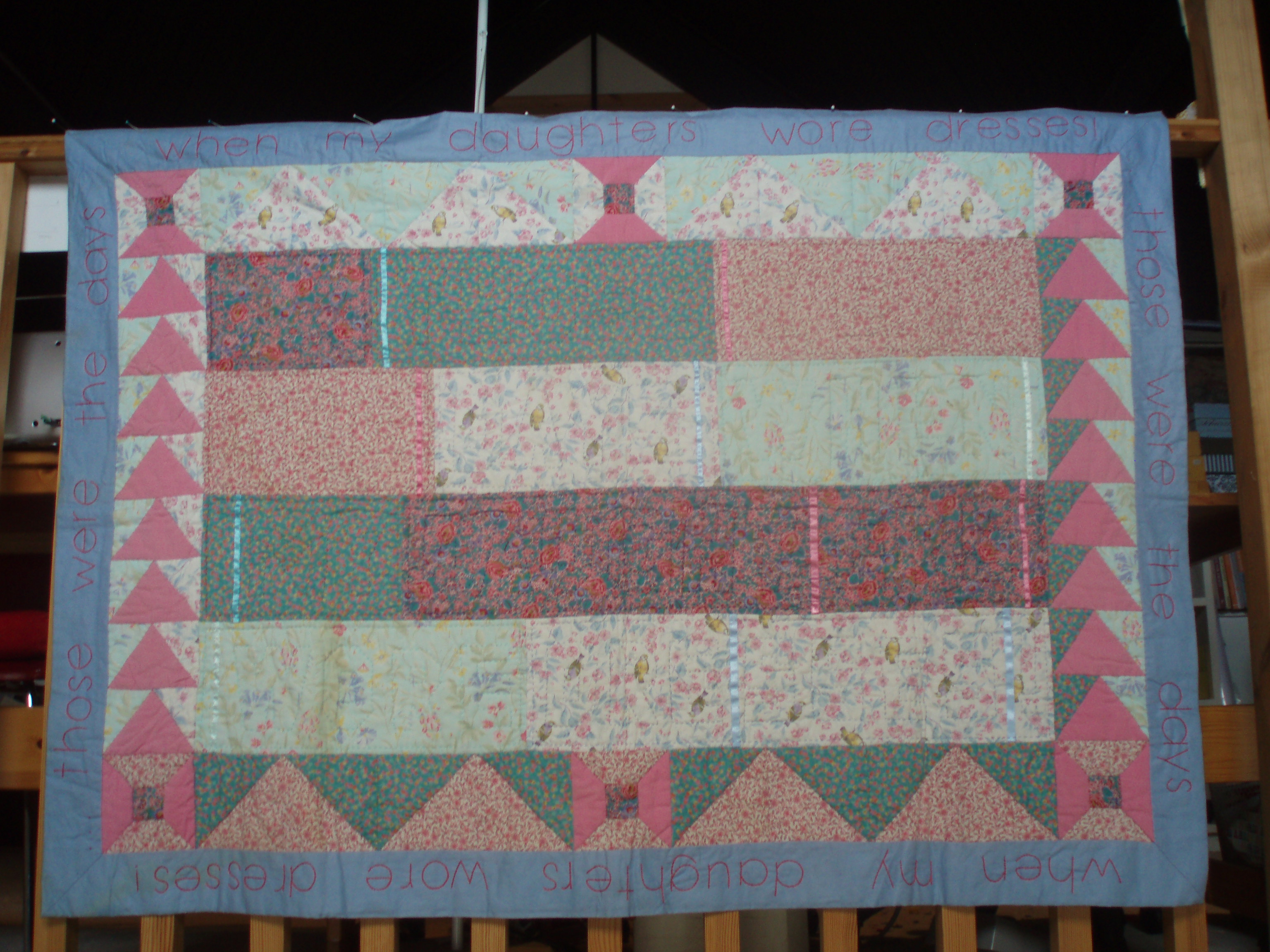 This is one of the first quilts I made, called ‘Those were the days when my daughters wore dresses’. Much of it was hand-pieced and hand-quilted, with embroidered letters around the border. The sentiments were of nostalgia for the time when they were little girls in printed cotton frocks!
