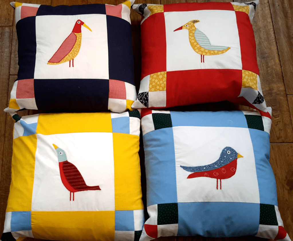 Not a quilt, but some appliqué cushion covers, which were based on some tiny wooden birds from another, different, trip to India. The little ornaments were just half an inch high but I drew and painted them and then used them as inspiration to form the basis of the ‘Quirky Birds’ cushion covers. (The pattern is here.)