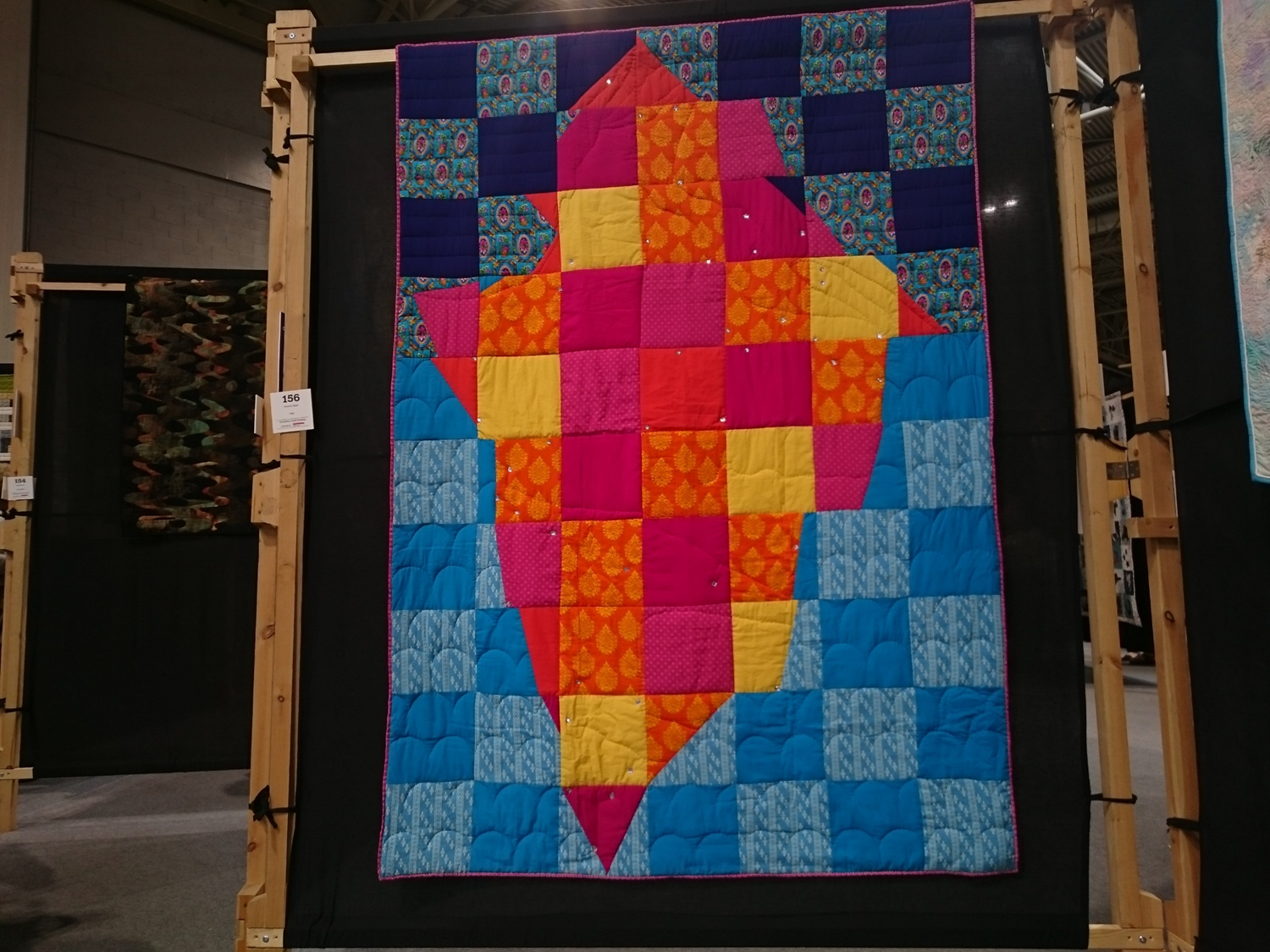 This quilt ‘India’ was at the Festival of Quilts 2017. 2017 marked 70 years of India’s independence and the quilt has 70 squares. The fabrics were purchased in India whilst visiting the country with my husband who was attending a conference in Chennai. It is hand-quilted and there are sparkling beads to mark each of the major cities.