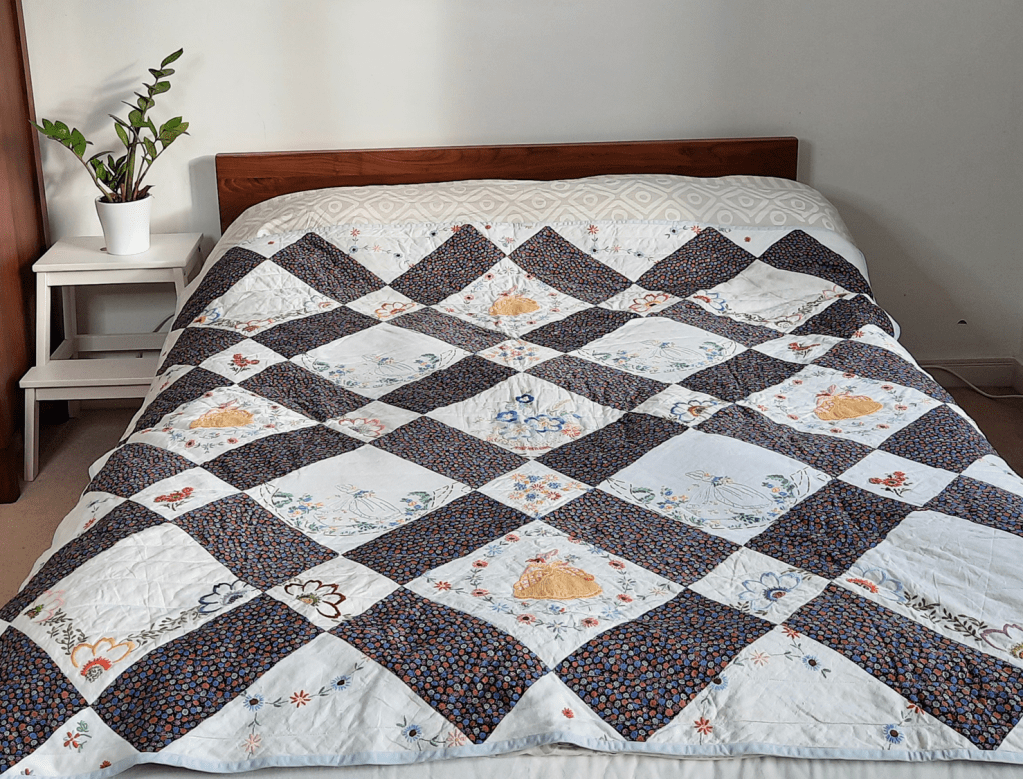 I just love the beauty of vintage hand-embroidered textiles for the home. I made a collection and then made two quilts from them. The quilt is called ‘Forget-me-not’ (the pattern is here).