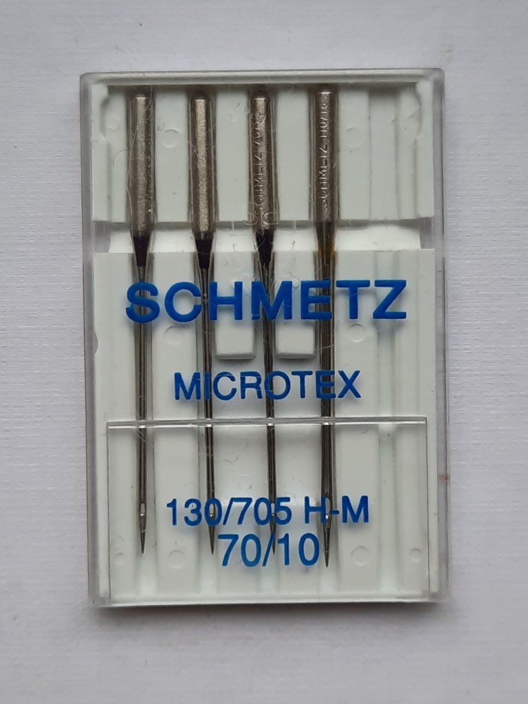 You saw some 70 needles in the mixed pack of needles pictured higher up the page. These are also used with lighter-weight fabrics such as lawn and most quilting cottons. The needles pictured below are ‘micro-tex’; they have a particularly sharp point. This is very useful for accurate piecing when you are making patchwork blocks with a quarter-inch seam.