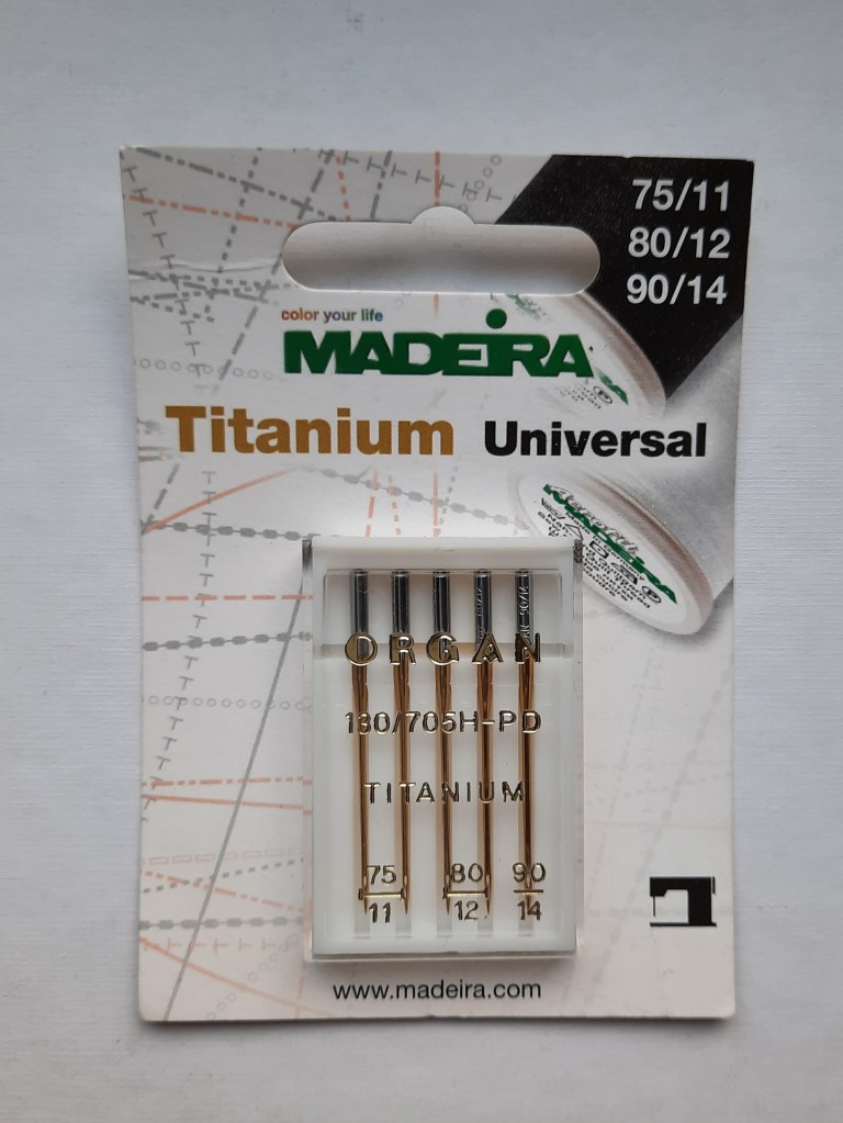 These needles come in some of the sizes discussed above (the packet below has 75, 80 and 90 sizes included). The difference here is the material from which the needle is made. The inclusion of titanium makes the needles strong and long-lasting, so the ones shown below could be used for piecing (75 or 80) and quilting (90) if you are making quilts.