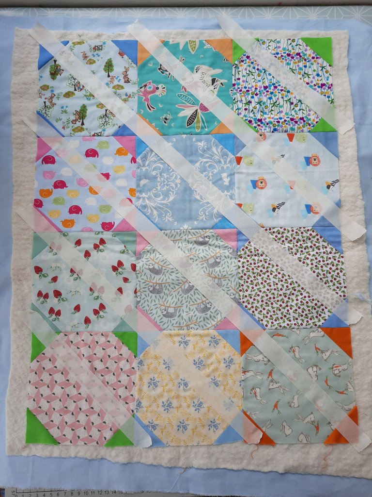 Working from one corner of the quilt, I placed strips of tape running from the corner of a block diagonally across to the other side, as seen in the below.