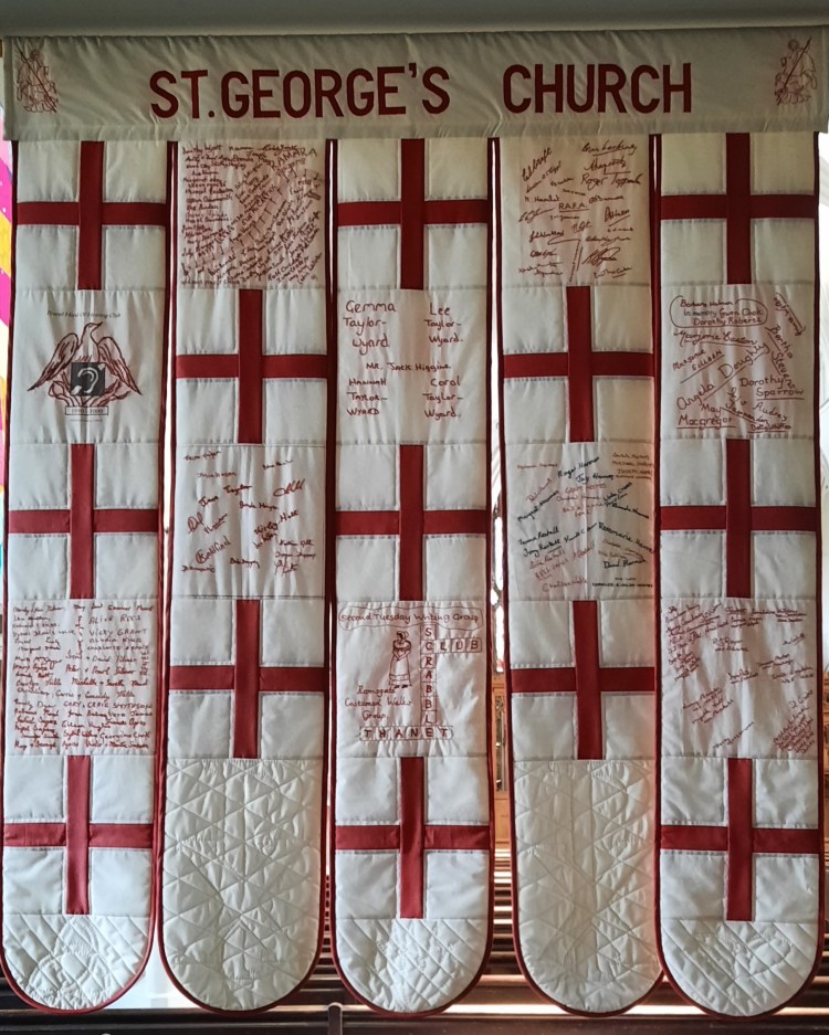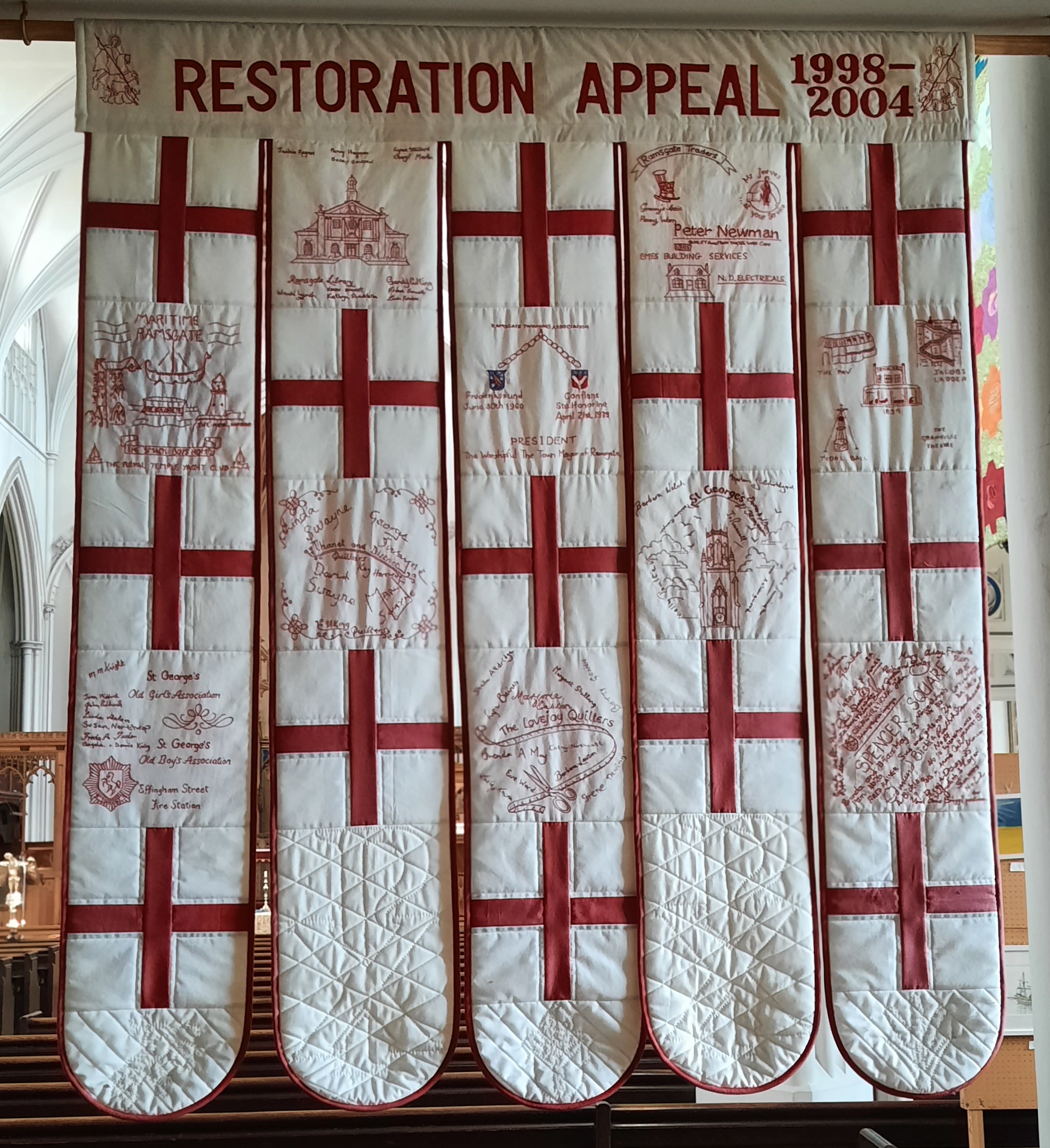 My quilts are in good company. St George’s has two very distinctive double-sided quilts made at a time of intensive fund-raising in the period 1998-2004. They were made by Canon Quilters. The red-on-white scheme is particularly striking. Here are the two banners, as seen on entering the church.