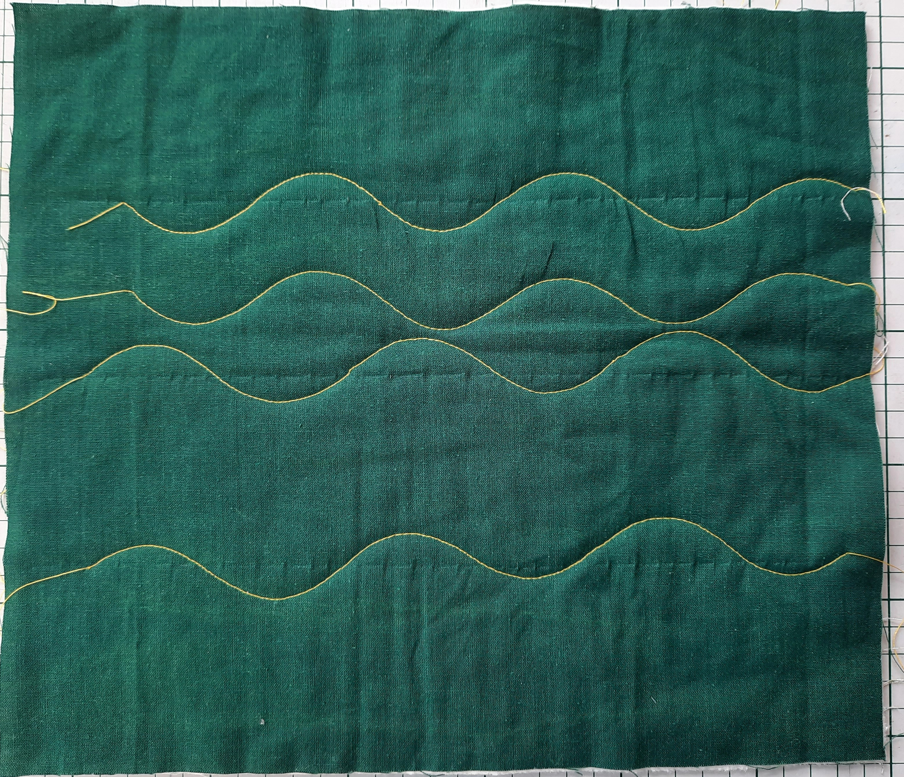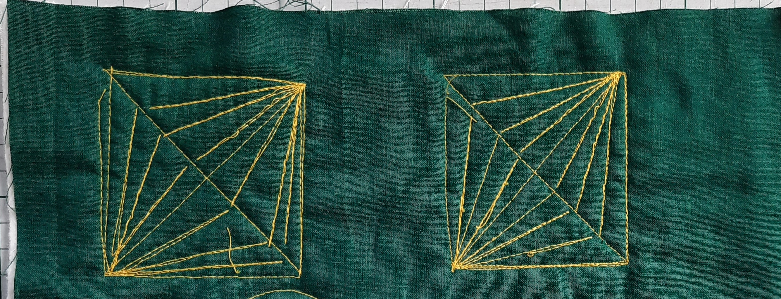 The two shapes on my practice piece below were made using the straight ruler. As this is all free-motion machine embroidery (with the feed-dog down) the challenge is to regulate the length of your stitches whilst also concentrating on the design you are aiming to create.