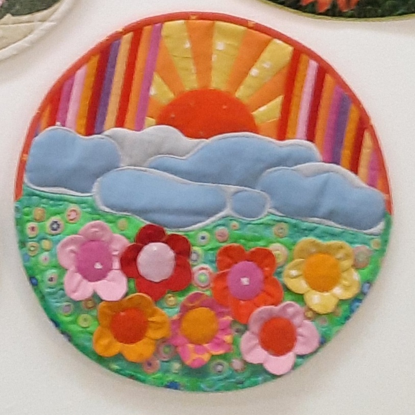 The artist’s statement says: The cotton batiks evoke the colours of leaves and undergrowth in the beech woods near my childhood home. Between groups of trees are clearings with glimpses of the sky. Variegated thread echoes the play on sunlight on the foliage.