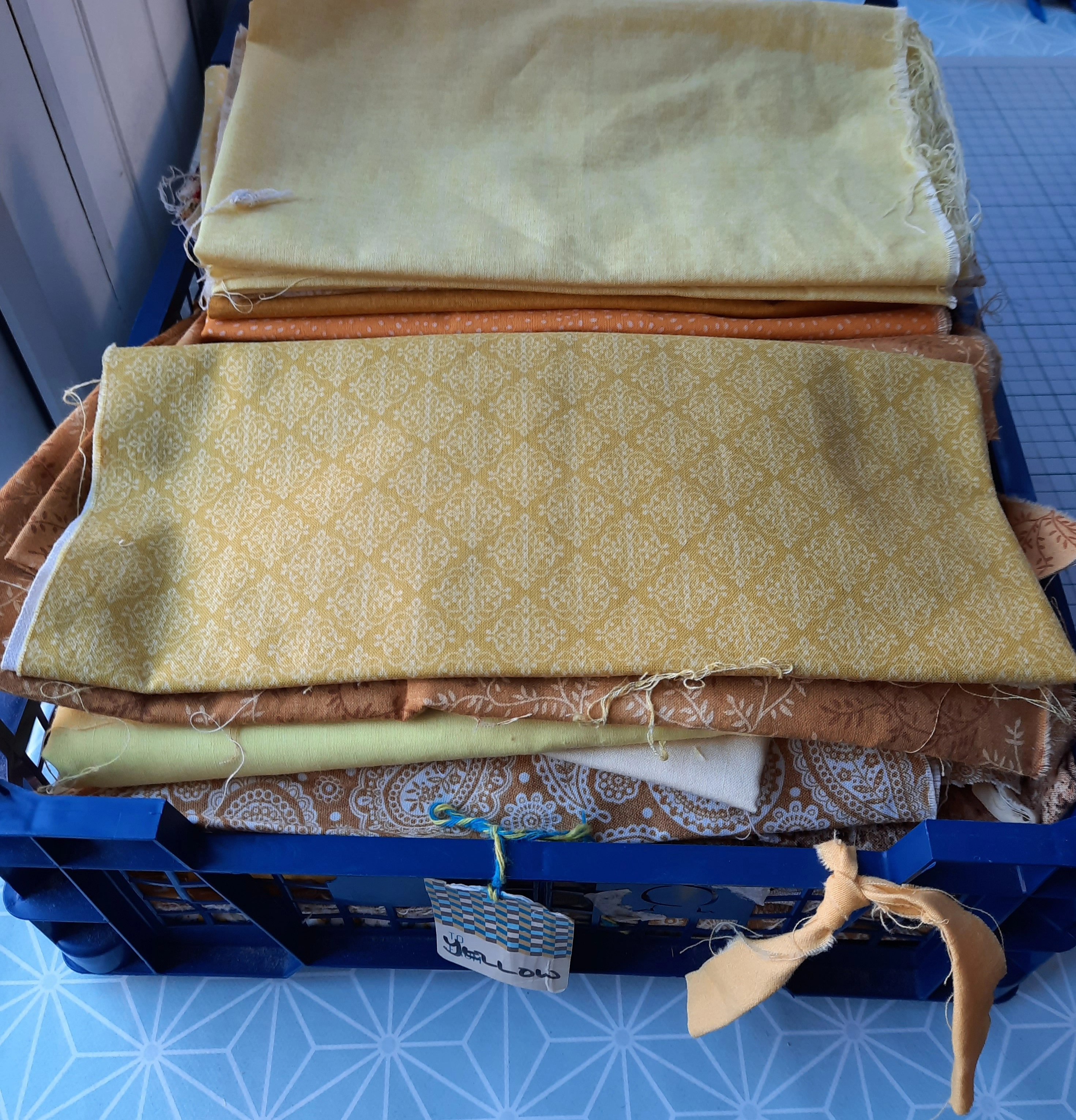 I went through every box of fabric (my fabrics are sorted by colour and the pieces are usually a fat quarter or so in size). I took out all the pieces I thought I would never use and donated them. Here is the box of yellow fabrics after sorting,