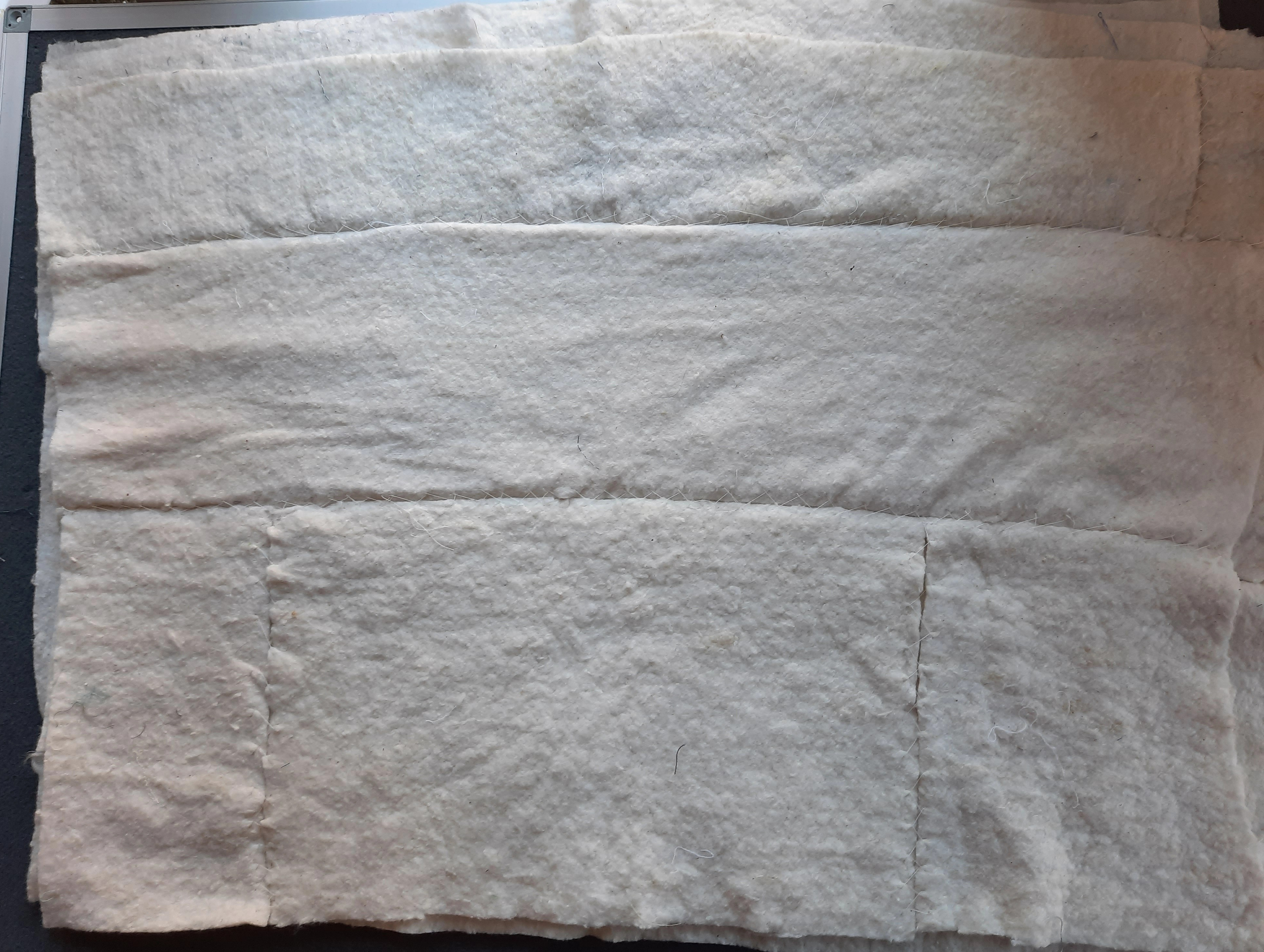 The next step was going through all the scrap pieces of wadding. I sorted them by fibre: although I now only use 100% natural fibre wadding, there are leftover pieces of 100% cotton, of wool, of 80/20 and some (quite old) pieces of 100% polyester. (NBThere is a post here about how to choose between different fibres.)