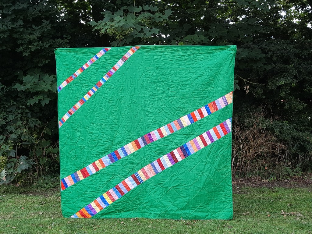 This quilt has ‘scrappy’ elements: each of the tracks is made up of scores of coloured strips. Precise measurements are given along with the exact colour selection (if you choose to make your quilt the same way).
