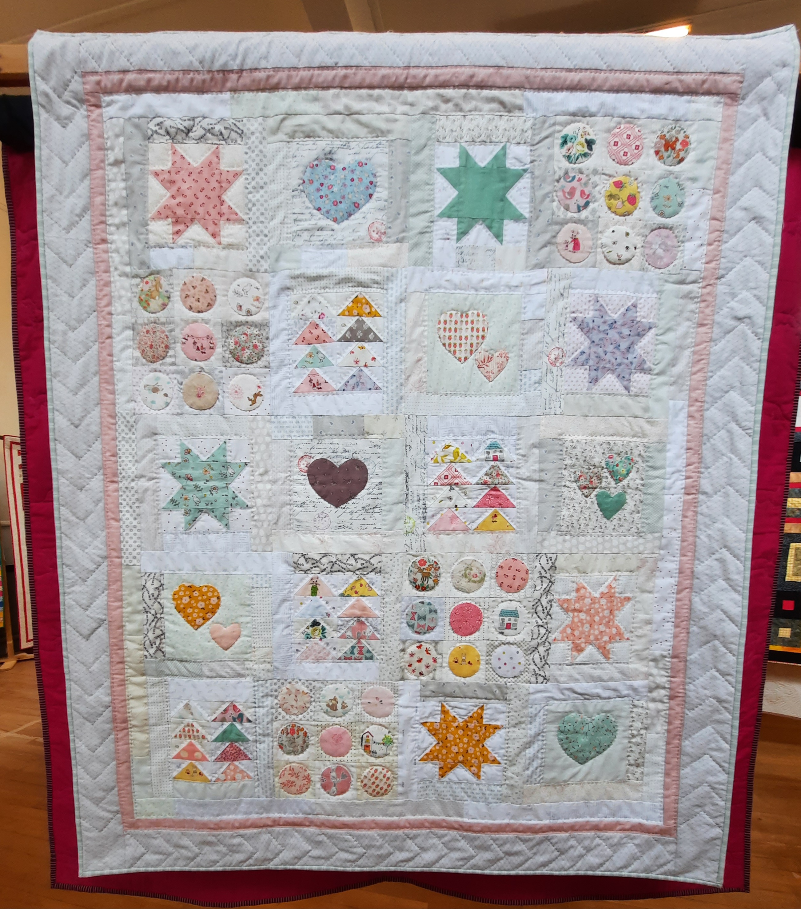 ‘Mabel’s Quilt’ by Sandra James (adapted from Susan Smith’s ‘My Family Quilt’) is so pretty: the combination of pastel colours and the pretty hearts added by the maker make for such an attractive quilt.