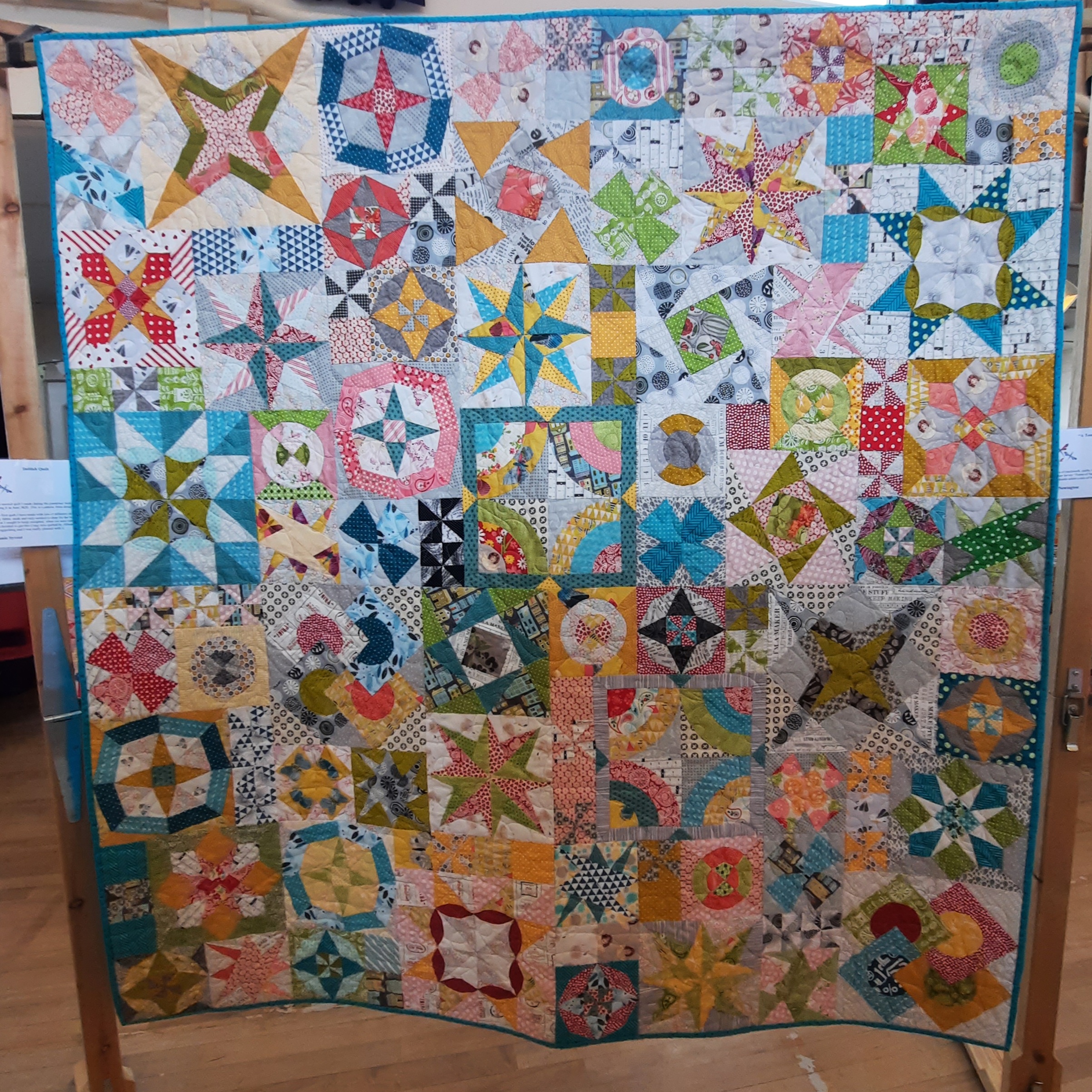 This quilt ‘Surrounded by Stars’ by Liz Newington was hand-pieced from fabrics donated by family and friends and machine-quilted. So eye-catching!