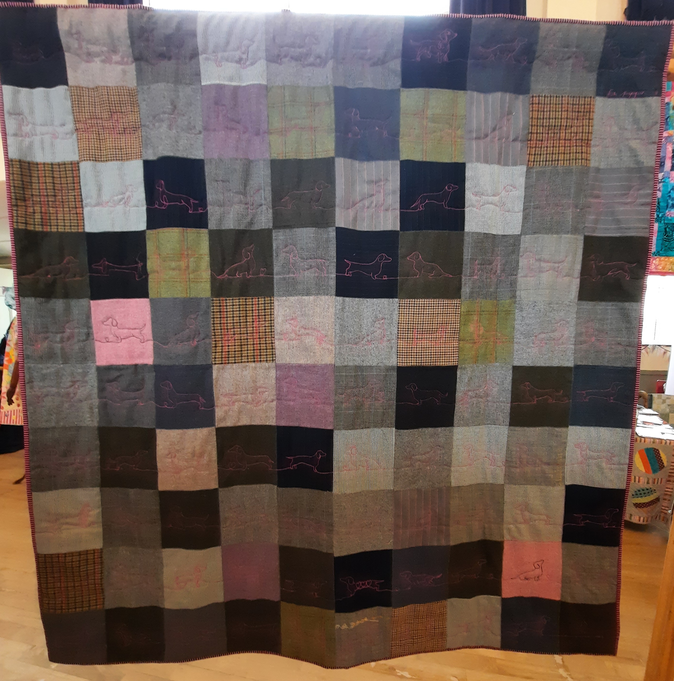 I also enjoyed the soft tones of the squares of tweed and suiting fabric in this quilt by Liz Newington, called ‘A Tonne of Sausages’.