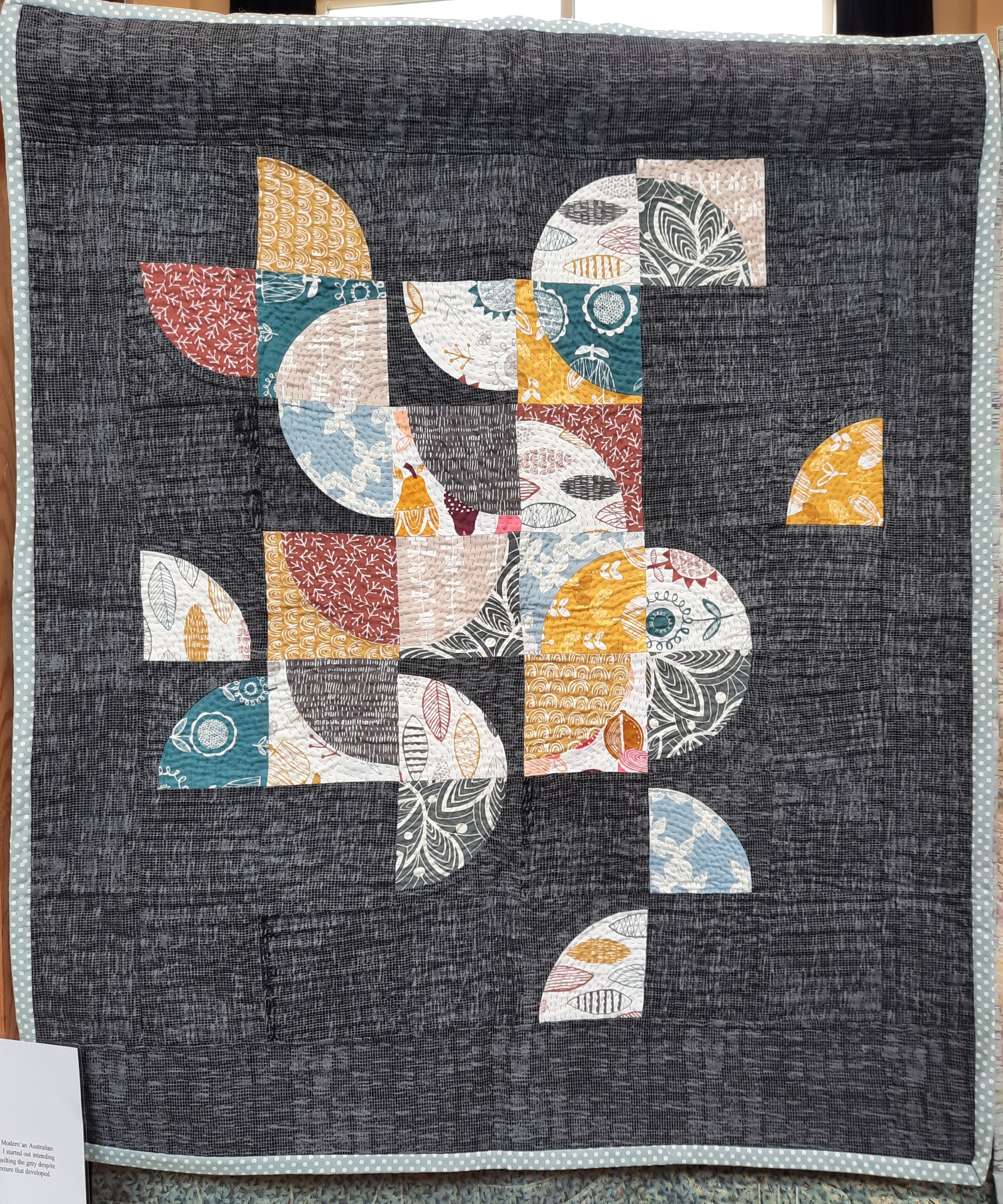 This quilt, ‘Modern Grey’ by Di Hawkins, was made from a pattern by Jackie White in ‘Make Modern’ magazine*. I loved the effect created by the textural quality of the background fabric in contrast to the modern prints in the pieced shapes.