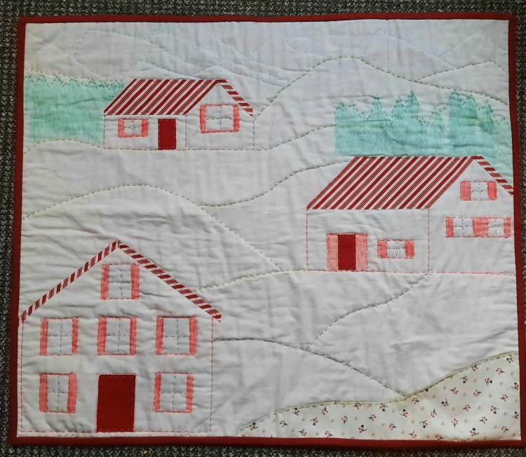 Sixteen members of the group (including me) took up the challenge. While I was thinking about what I would make, I received a postcard from a quilting friend in Switzerland showing a naïve, folk-art style painting of a Swiss village. As it happens, many years ago, I lived and worked in Switzerland for a winter season after leaving school and before going to university to study languages. Although I was based in a newly-built modern resort, there were plenty of traditional villages and hamlets in the area round about. Something about this fabric reminded me of a chalet roof covered in snow. So I decided to make a Swiss village in fabric.