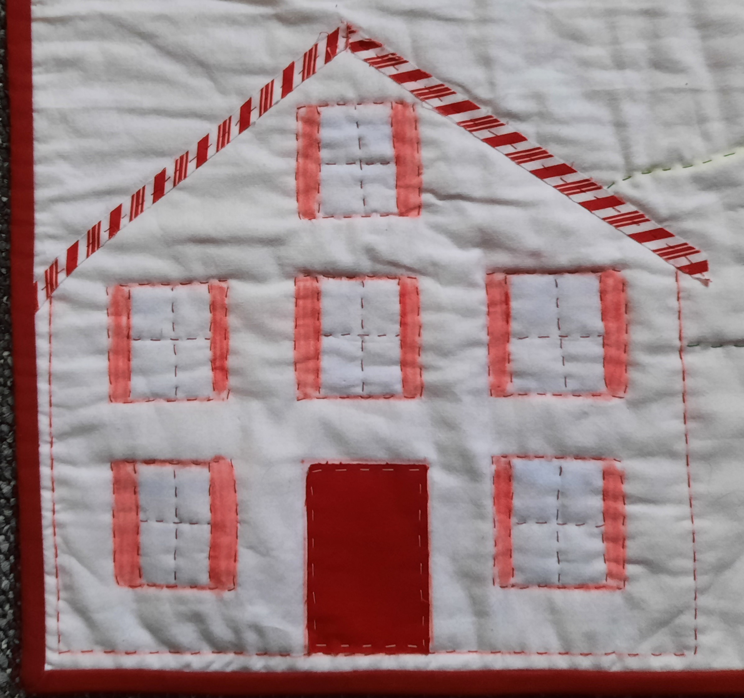 The eaves and door were bonded in place and I used Inktense pencils to draw the windows and shutters before adding hand-quilting.