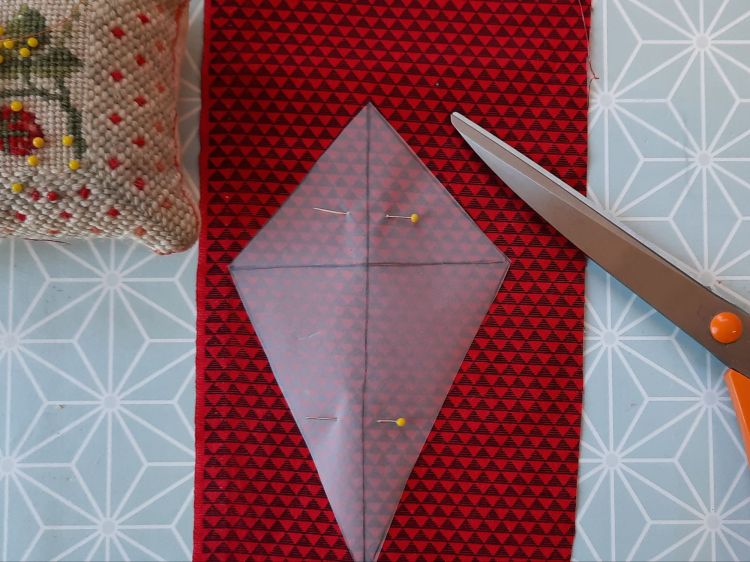 1 Download the template for the central panel of the block using the pink button below. Set your printer to print at A4/letter with narrow margins. You may lose a little of the image on the sides but the main information will be there. Trace the following shapes onto tracing paper (a) the outline of the outside of the kite (b) the top left triangle (c) the bottom right triangle (d) a small triangle from the bows on the tail of the kite. Cut out the tracing paper shapes and use them as templates for cutting out.