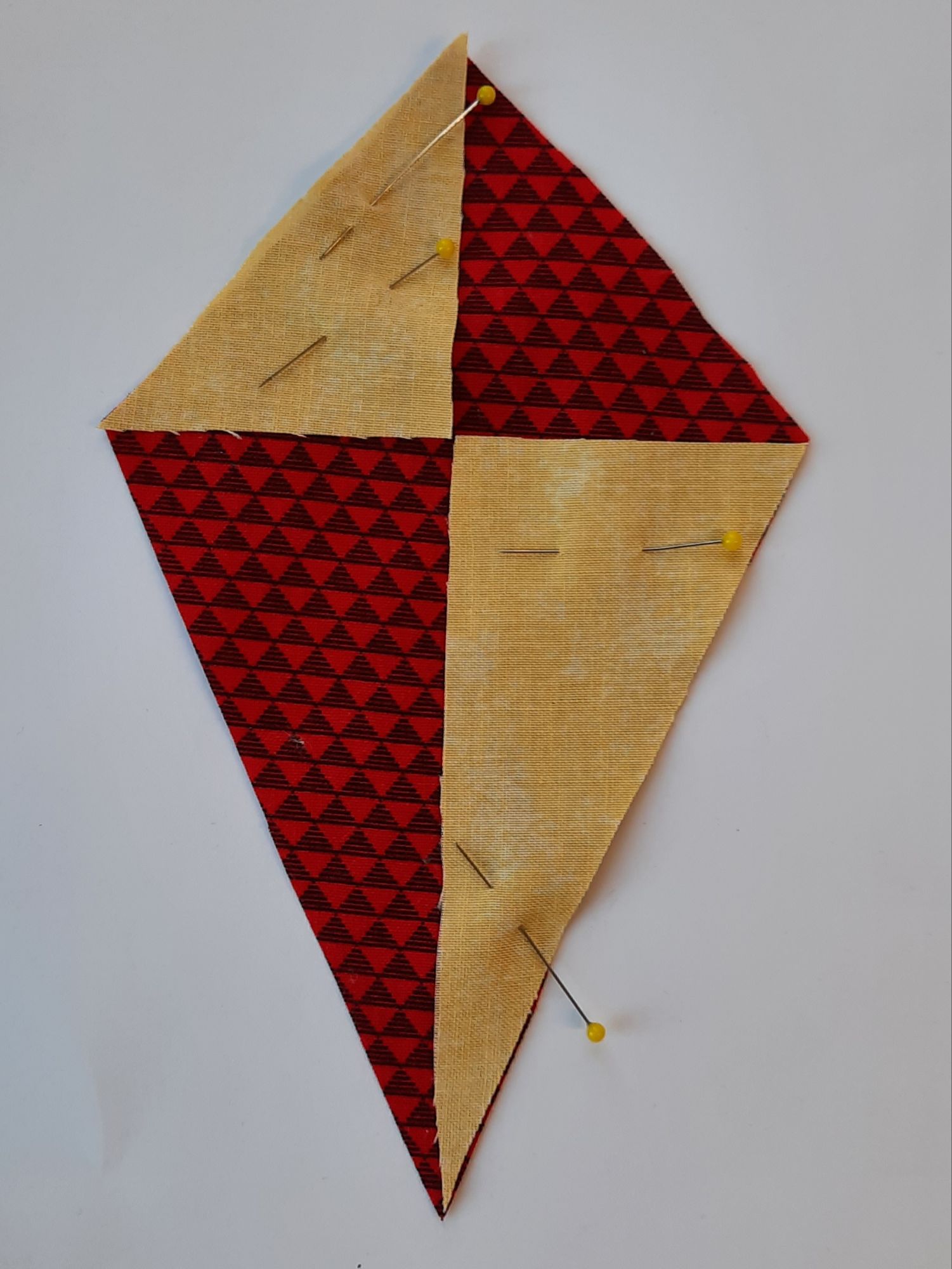1 Place the two yellow triangle on the top left and bottom right of the kite. Pin in place.