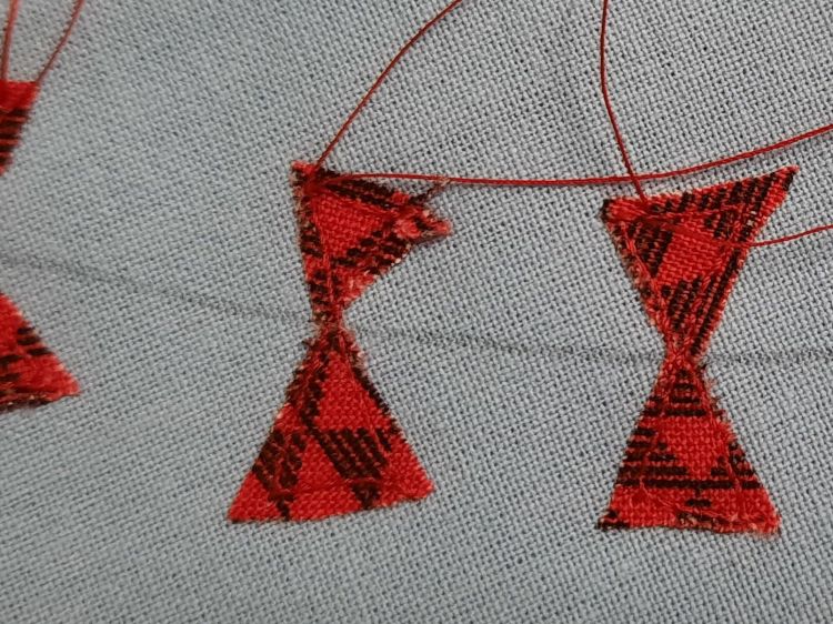 6 With the sewing machine set back to regular straight sewing and a stitch length of 2 sew round each pair of bows to secure them in place, finishing off the threads at the back.