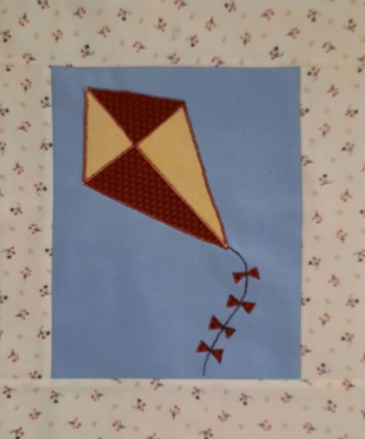 The block is made up of a central panel, featuring a red and yellow kite flying in a blue sky, framed by a white border. It measures 12½ x 14½” (12 x 14″ finished in the completed quilt).