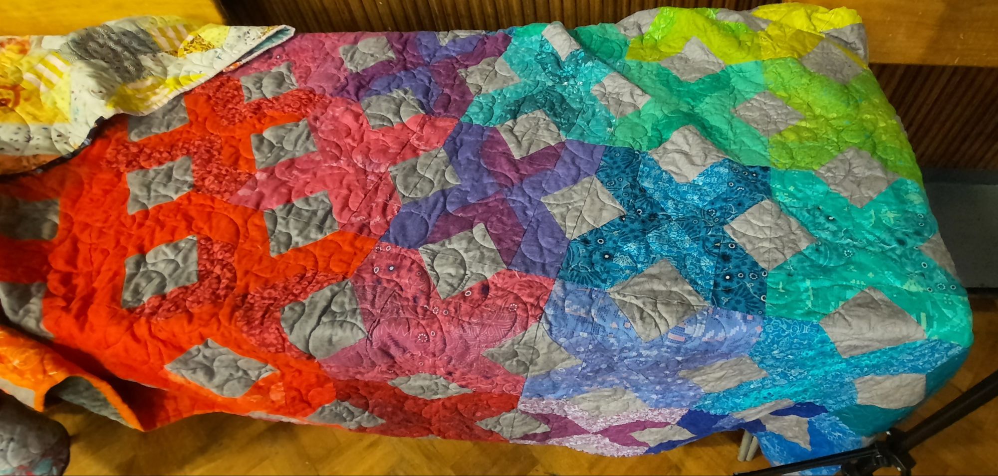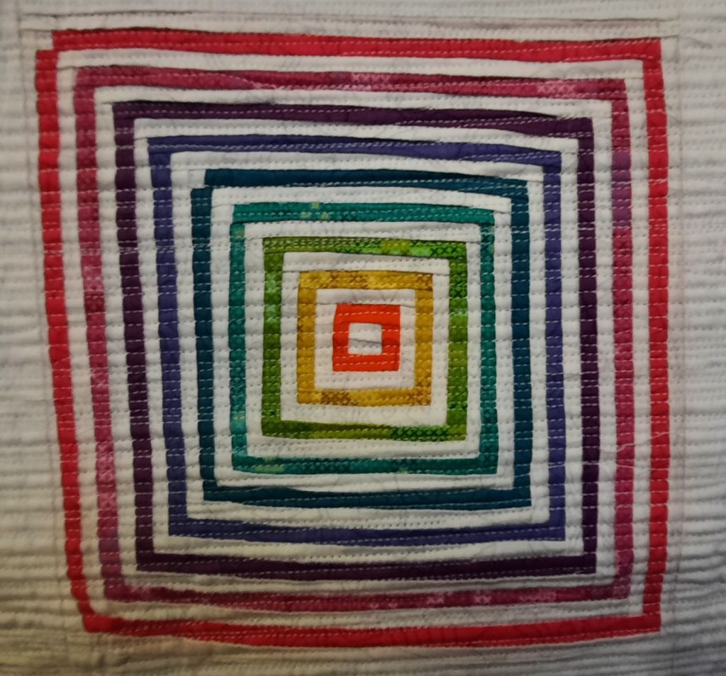 Another quilt on display was this one, using blocks in a mini-series ‘Sew the Rainbow’ designed by Giucy Guice using Alison Glass fabrics and both pieced and quilted by Kerry. These blocks, floating in their sea of white, are formed from truly tiny pieces of fabric!