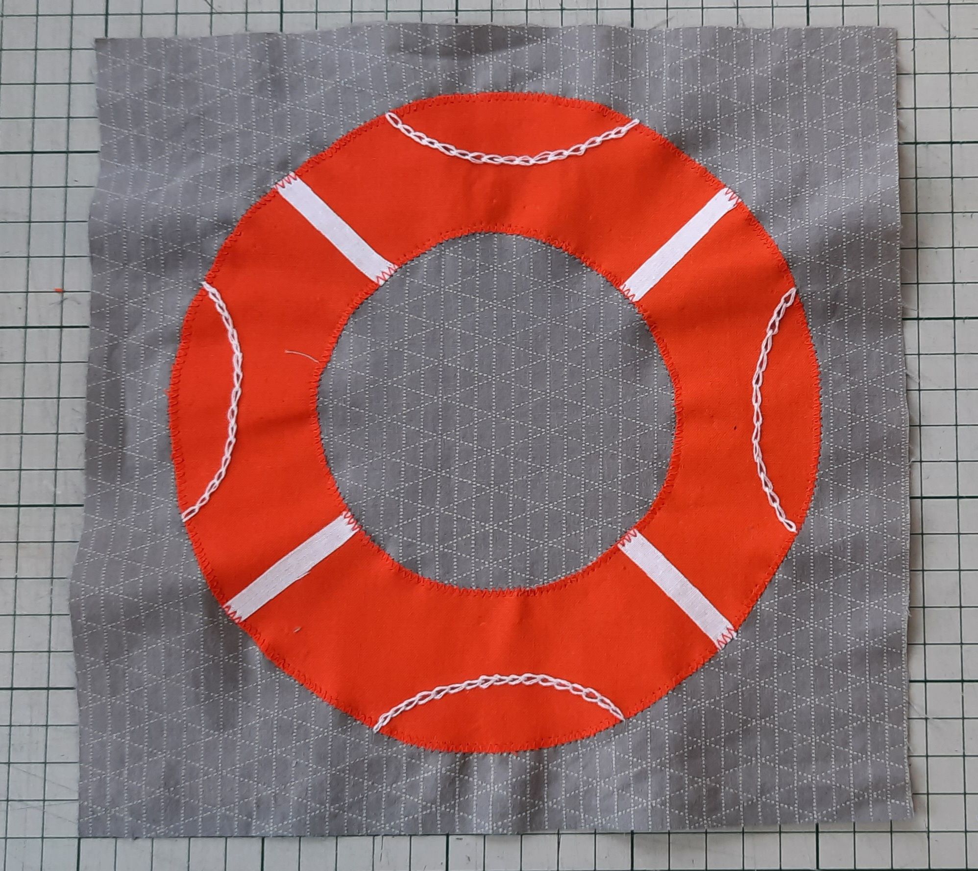 The block is made up of a central panel, featuring an orange lifebelt with white stripes, on a grey background, framed by a pale blue border. The straps are added by adding strips of white fabric. The rope is added by using chain stitch. It measures 12½ x 12½” (12 x 12″ finished in the completed quilt).