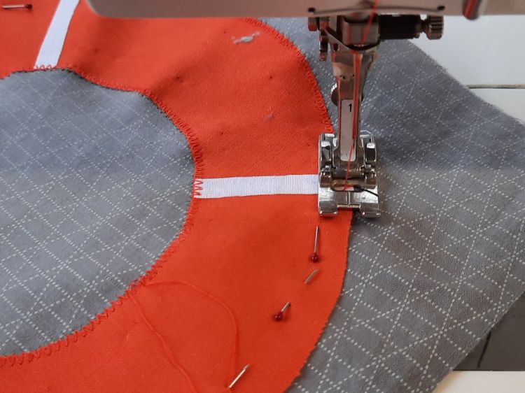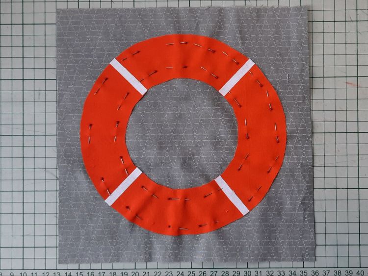 2 Pin the orange shape centrally on the grey background fabric. Small appliqué pins are very helpful for holding fabric pieces in place. Start with the centre circle: pin at 12 o’clock (if you imagine a clock face) then 6 o’clock, 3 o’clock and 9 o’clock), then fill in with pins in between.