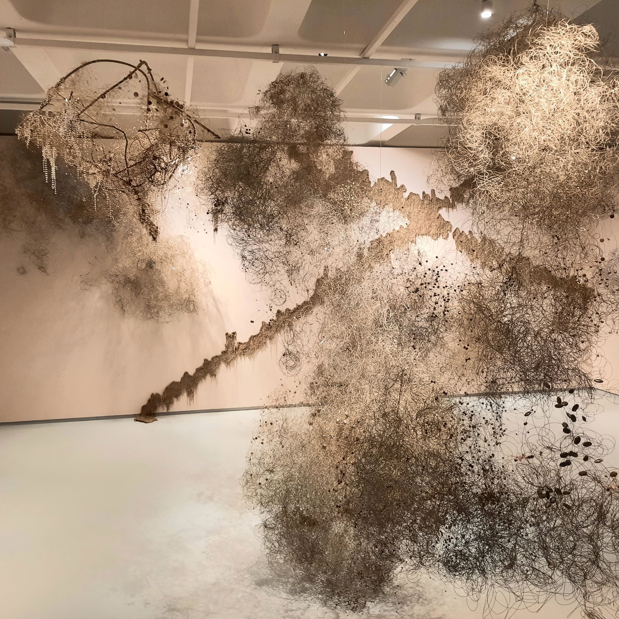 This is the room-sized installation mentioned above. It is difficult to show it well in a single photograph. It comprises areas of fine threads arranged in cloud-like shapes hung with glass and pearl beads and metal charms.