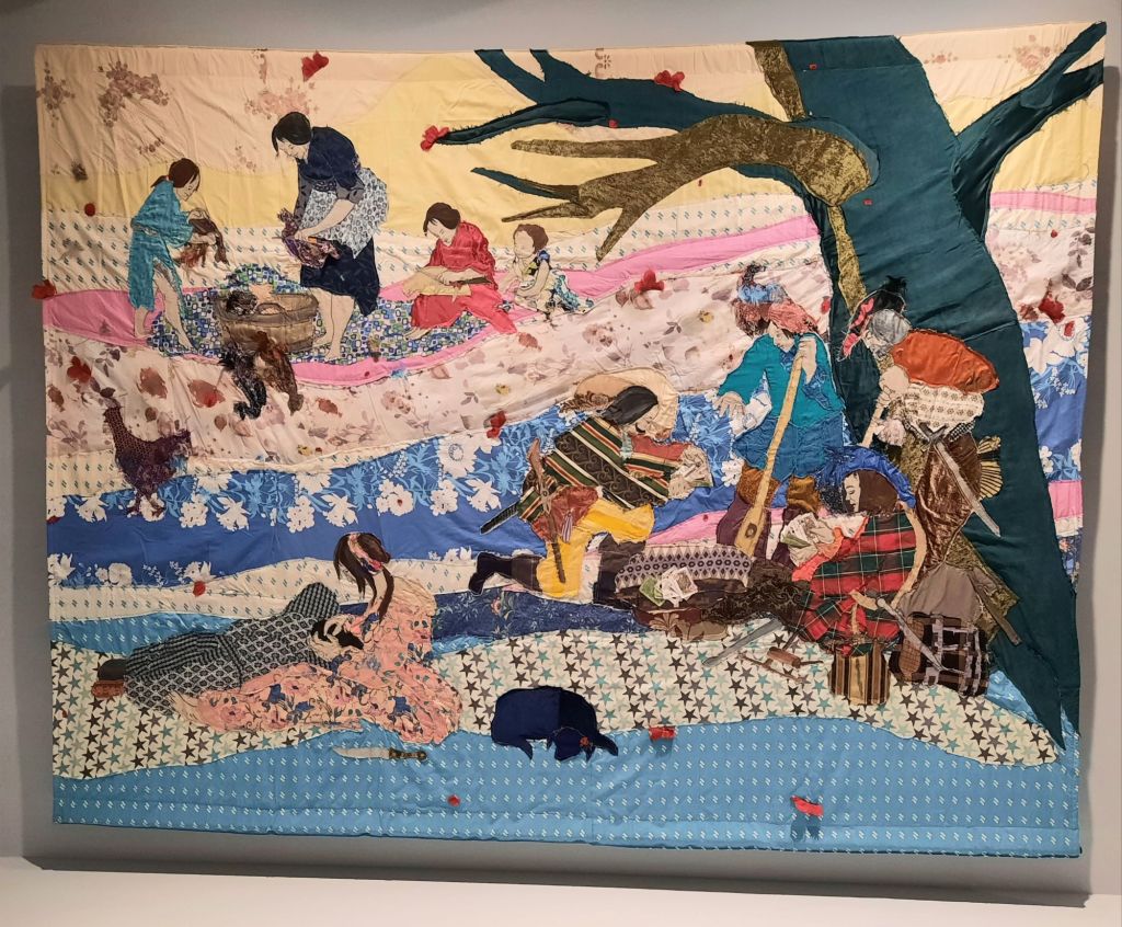 Another piece depicts the lives of Roma people in a sympathetic and positive way. The artist uses found fabrics; the colours and the composition are decorative and attractive.