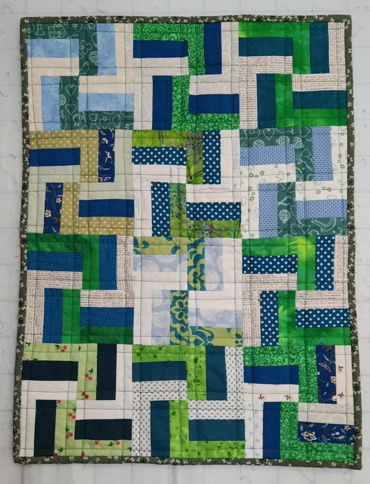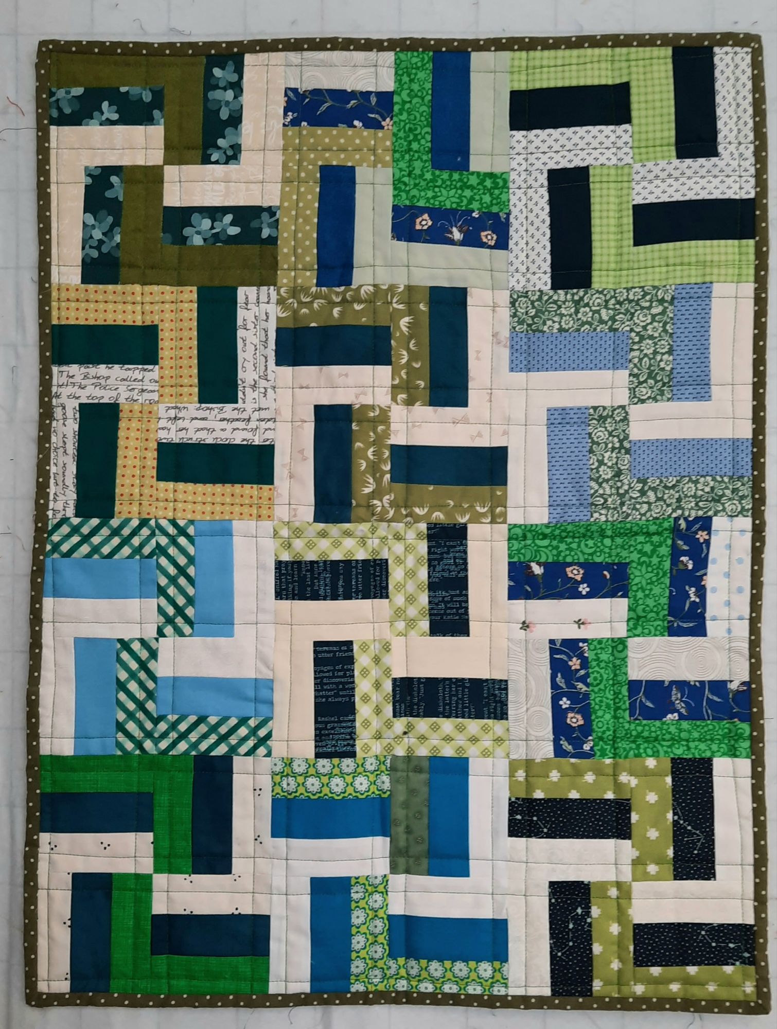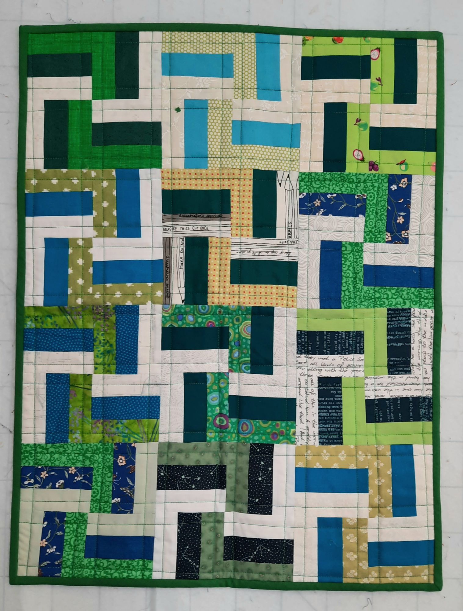 I repeated the process with the remaining three quilts, then layered them up with 100% cotton wadding and quilted them simply with straight quilting lines. Here they are: