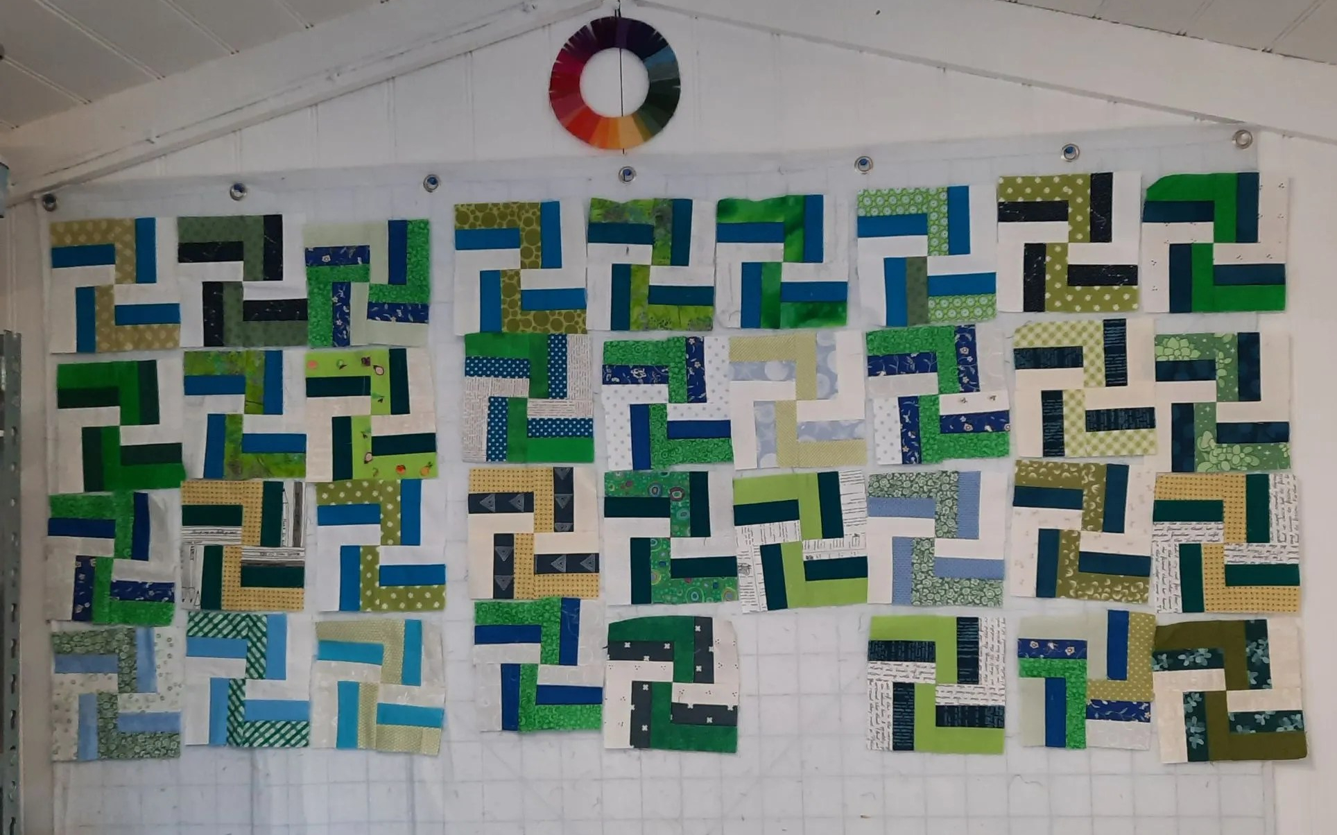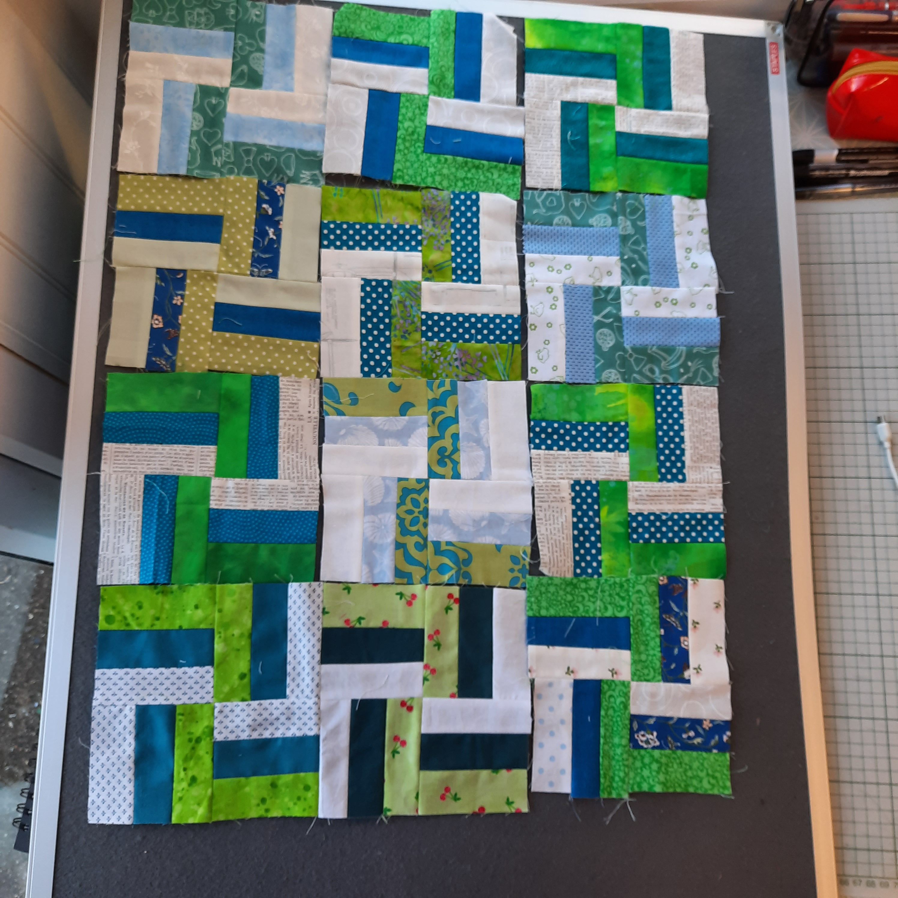 I changed the layout a few times until there was a balance of blocks across each of the four quilts. There is one gap, as you see, so I knew I had one more block to make.