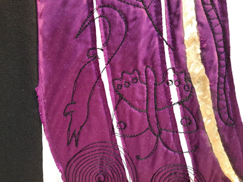 Close up, you can see the layers of fabric and the overlying stitched elements – a suggestion of the creatures to come. The whole piece conveys a wonderful sense of movement.