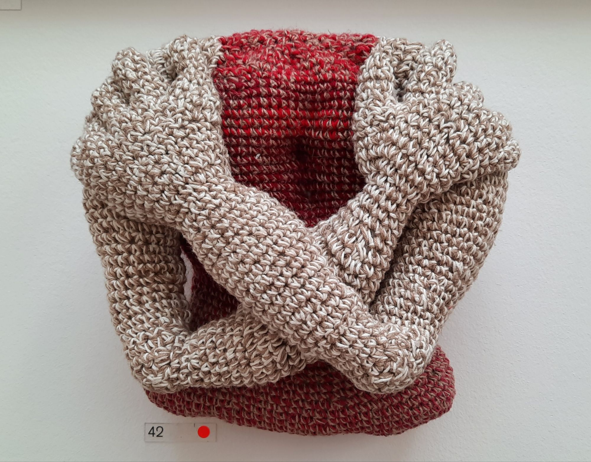 In contrast, this rather bold sculpture in red and neutral colours, created with knitting wool, makes a strong statement: