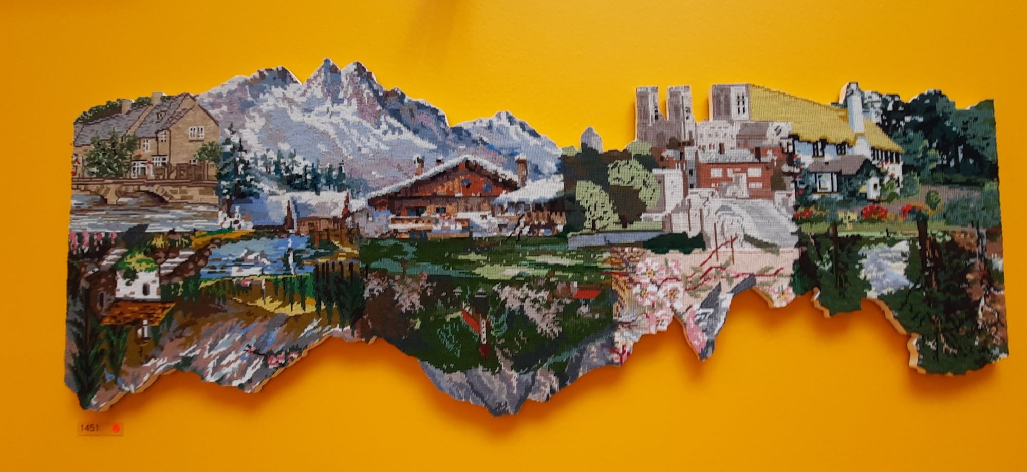 The long piece below was skilfully produced and intriguing. Clearly a number of vintage needlepoint pieces had been found, collated and carefully merged to produce an extended ‘landscape’ with reflection!