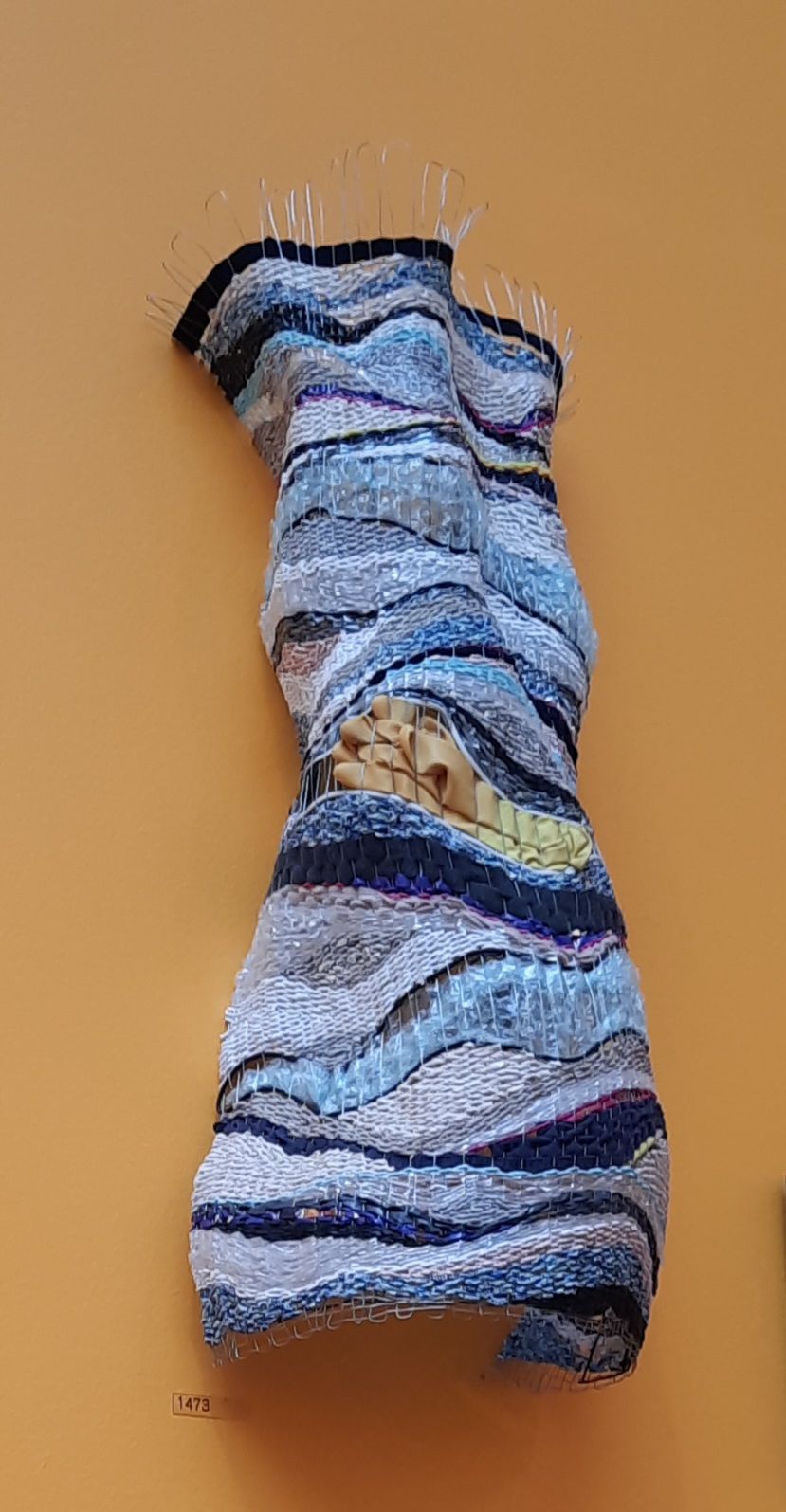 The piece below also included threads in the colours of the sea, woven onto a wire frame. Only at second glance does one see the yellow rubber gloves woven into the centre part, though a clue is right there in the title which mentions a well-known brand! Very clever.