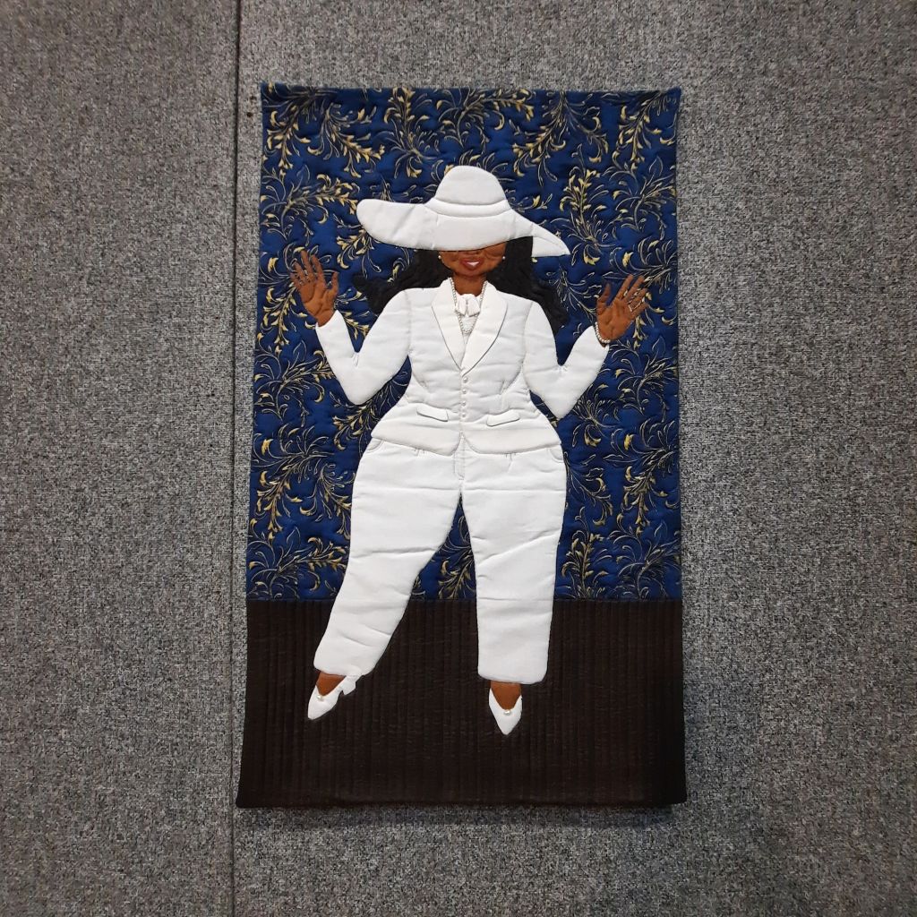 On the right-hand stand, bottom left side is a piece made by my friend Alison Moore, featuring reverse appliqué, hand embroidered lettering and hand-quilting: